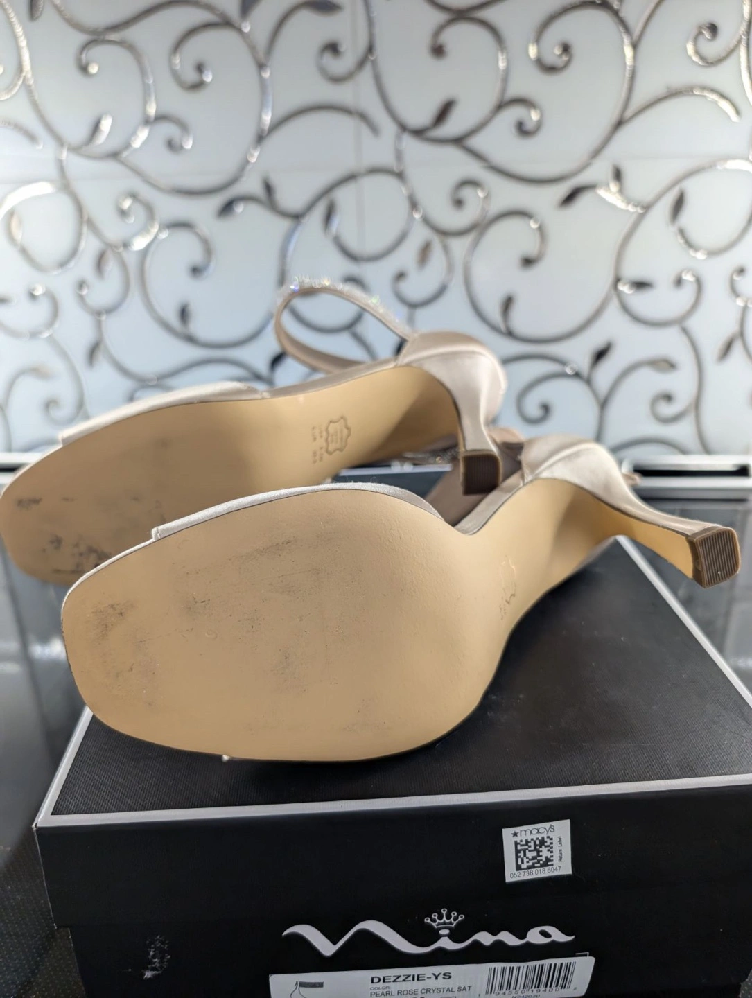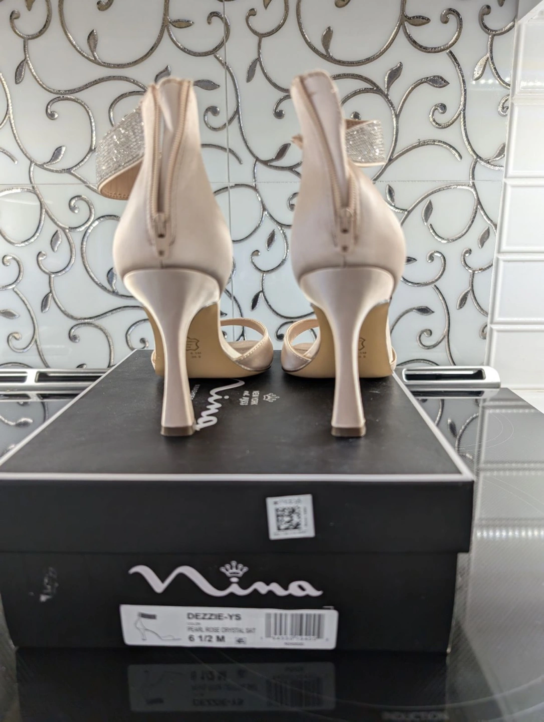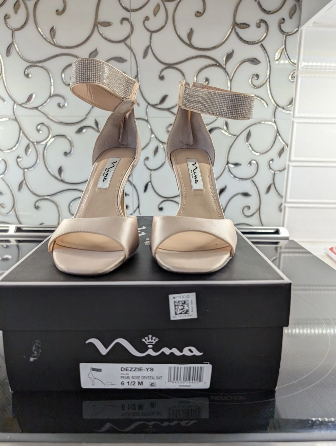Beautiful satin heels with crystal embellishments. Ankle strap with zipper closure. Size 6 1/2 M. New in box.