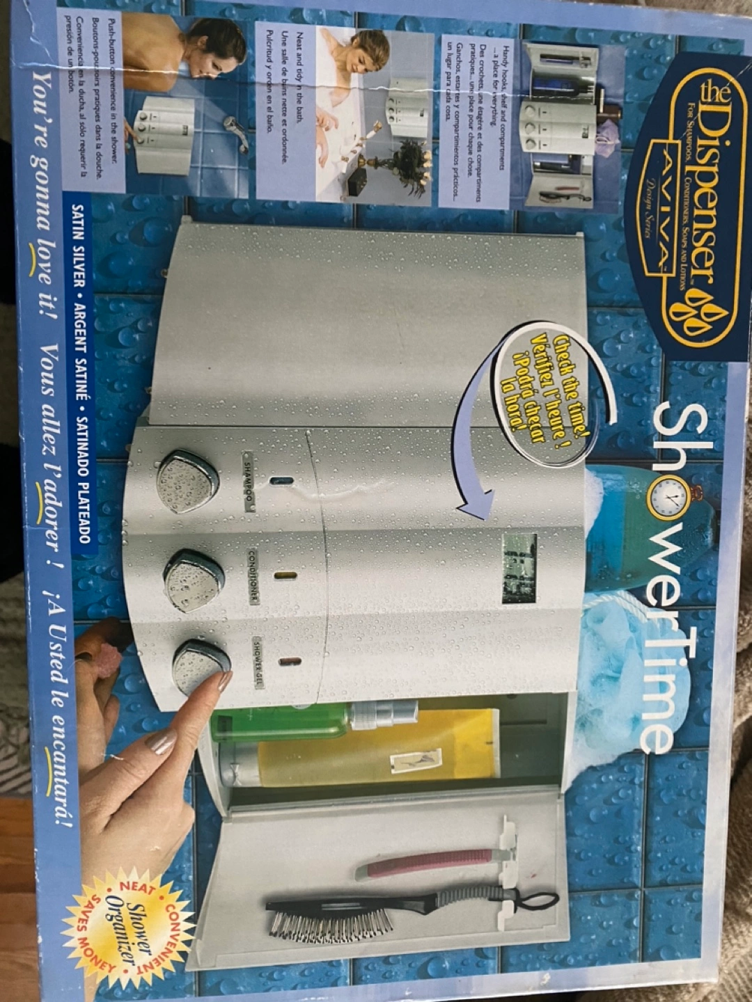 Shower dispenser, includes 3 pumps, a shelf, and hooks. Comes with silicone glue for installation.
