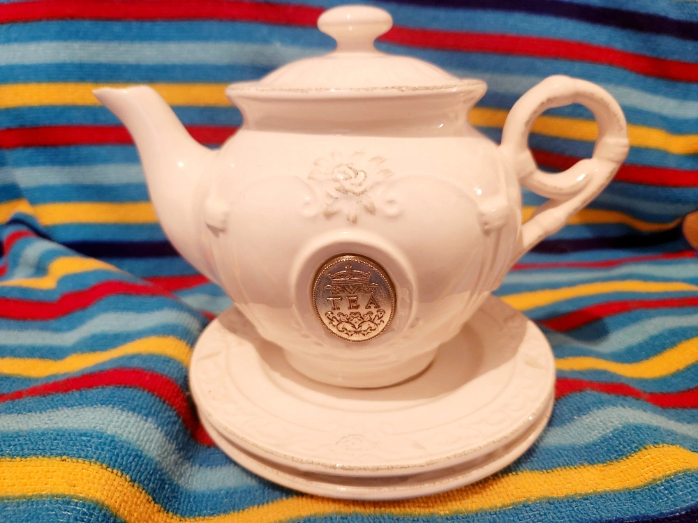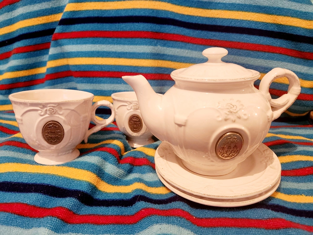 Cottage Style Teapot and Cups Set White teapot and two cups, ornate design with silver accents. Teapot has a matching cups and saucer.