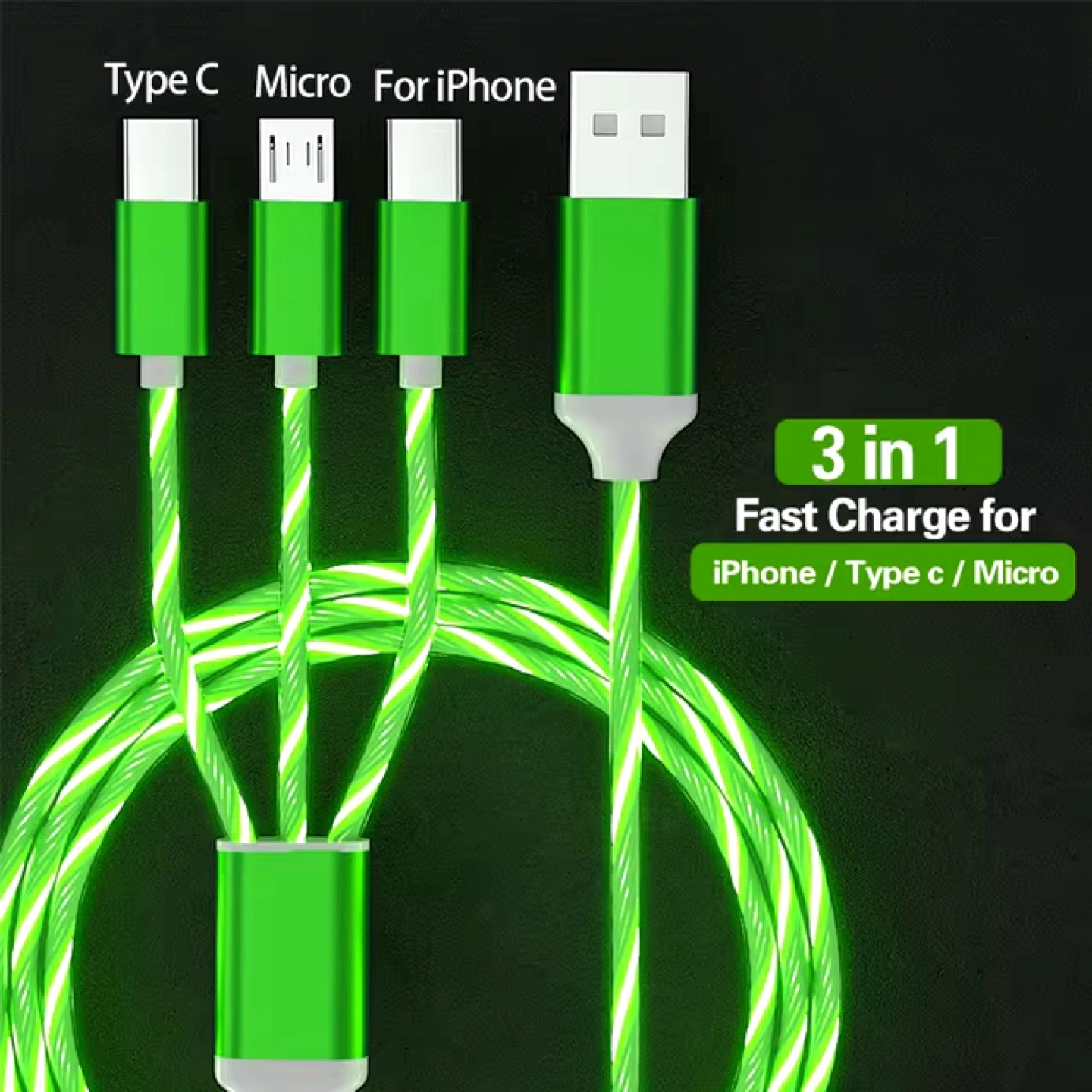Green 3-in-1 charging cable. Charges iPhone, Type C, and Micro devices.