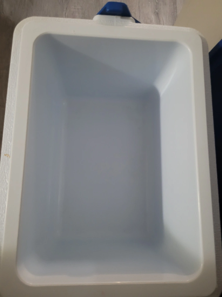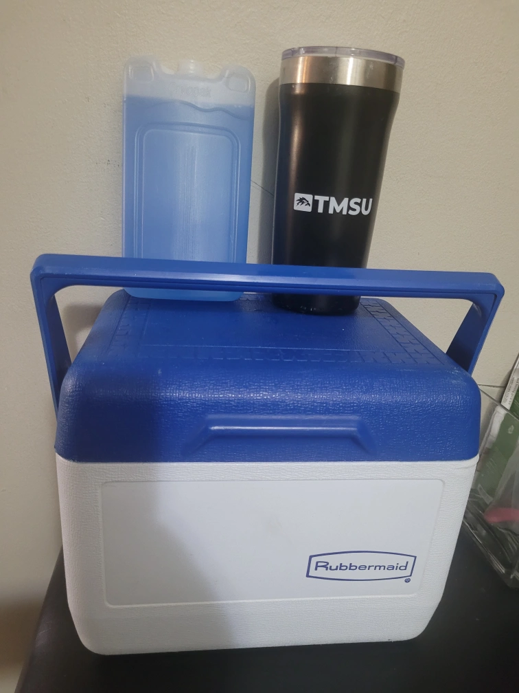 🥕Rubbermaid cooler, a big blue ice pack, and a black tumbler with a silver band. The tumbler has a clear lid. 🥕 Lid on tumbler cup has a small chip on it.