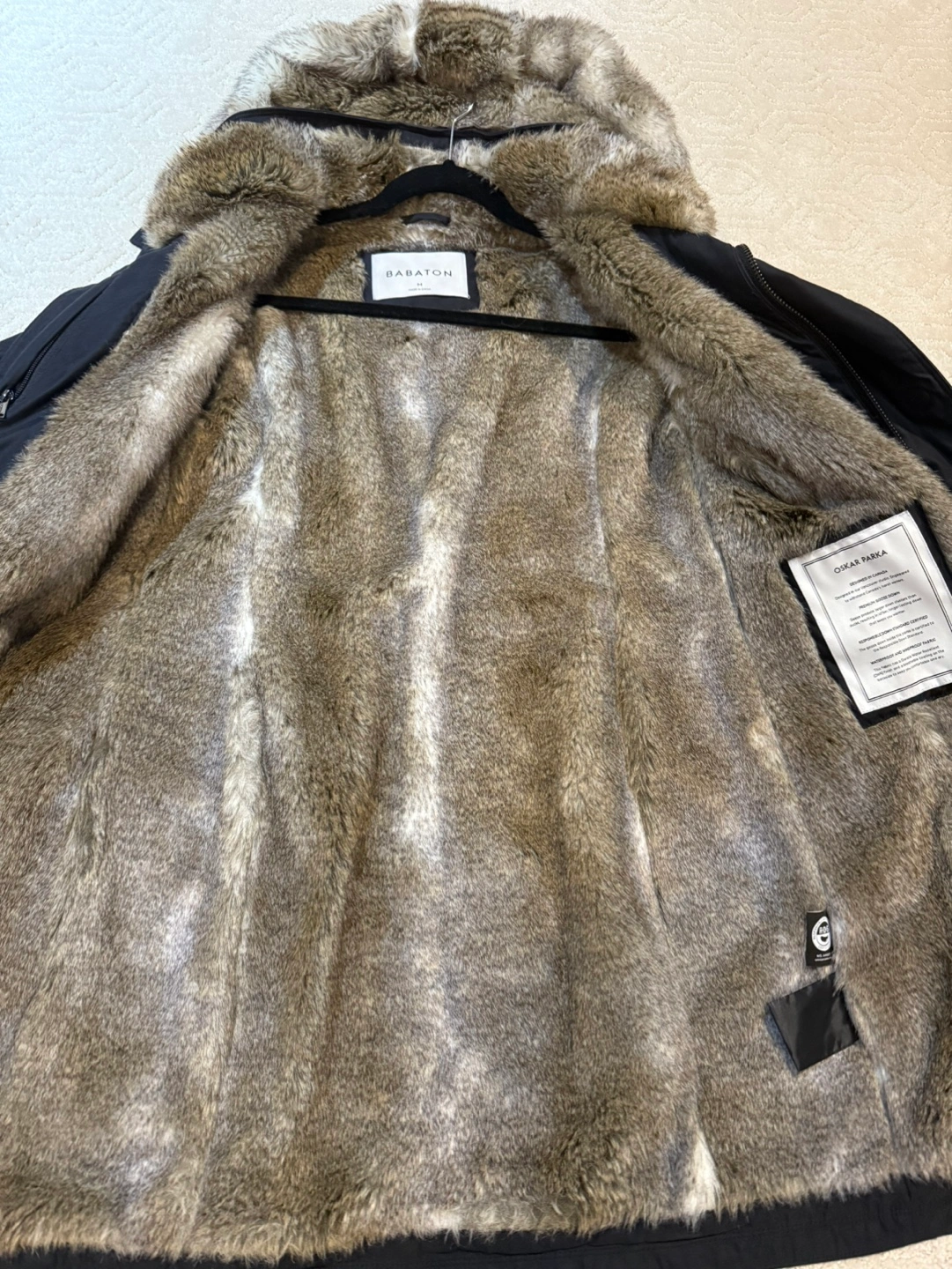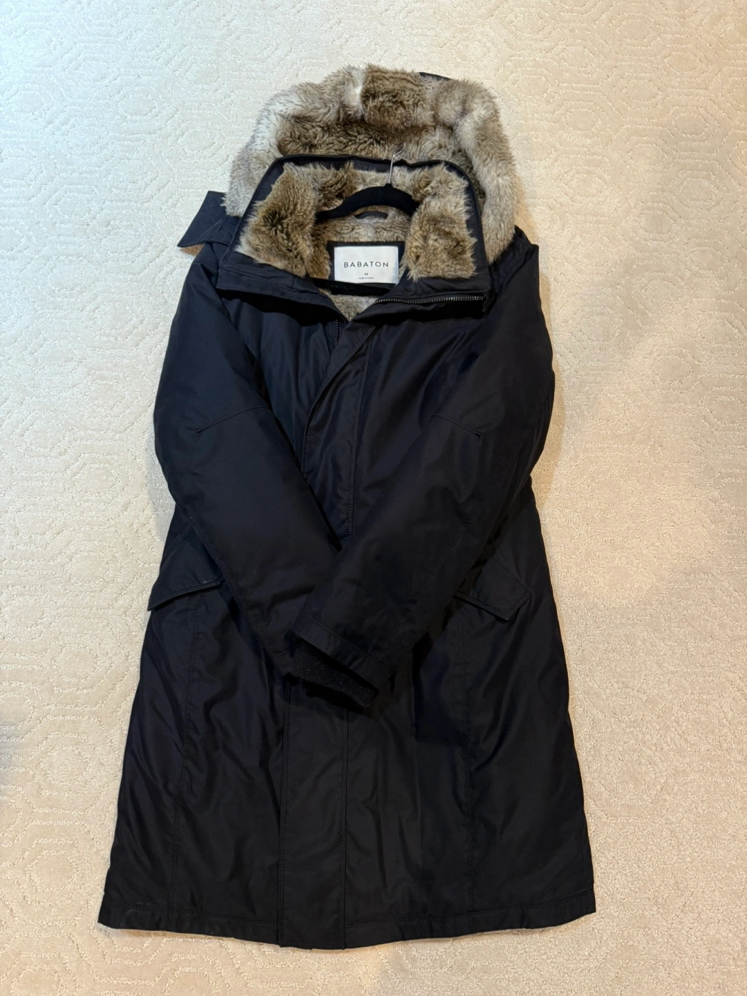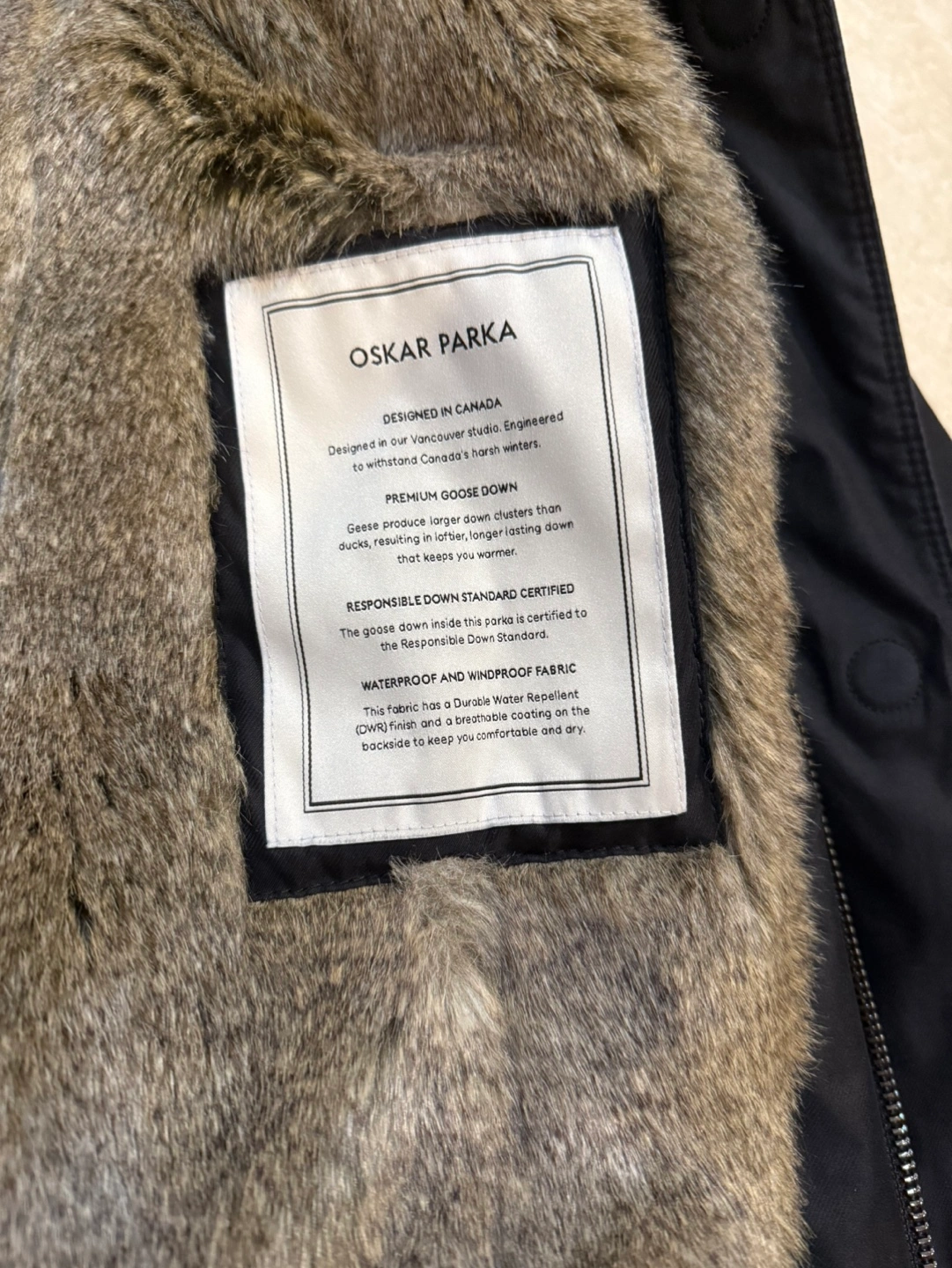 Black parka with soft fur-lined hood and jacket. Magnetic clasp for pockets and front of the jacket, so don’t have to deal with zippers. Water-resistant and windproof. 700+ fill Hits just above the knee, so it’s great for blocking out the cold wind and rain. Only wore for one winter season so in very good condition still. Only selling because it’s a little big on me. Retails for $328 before tax
