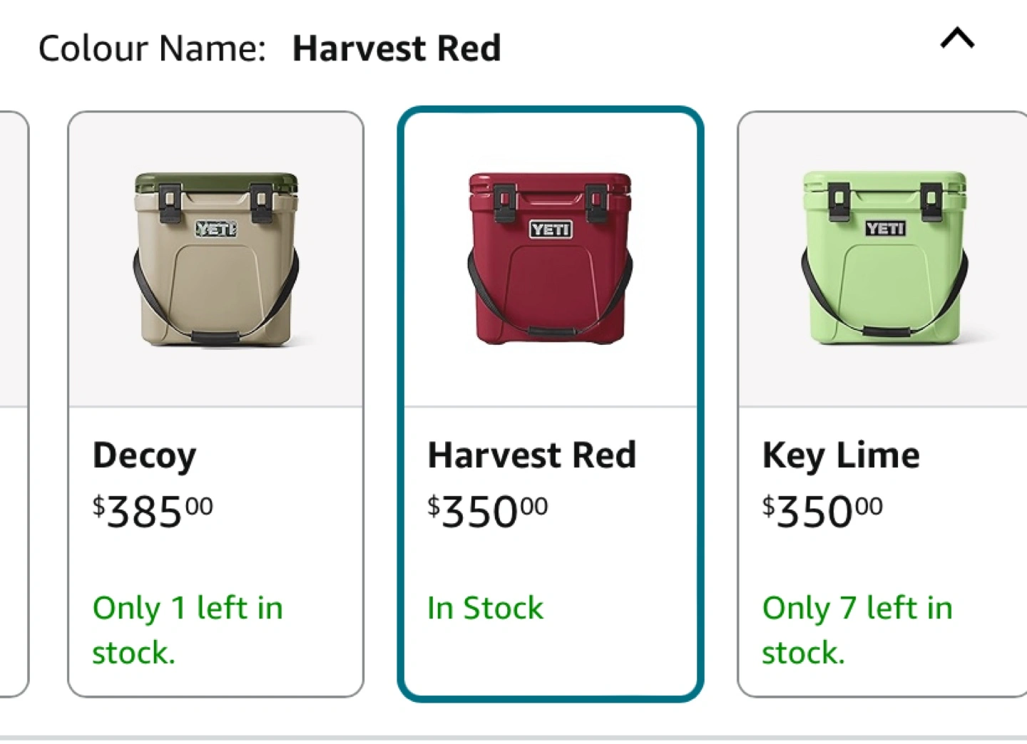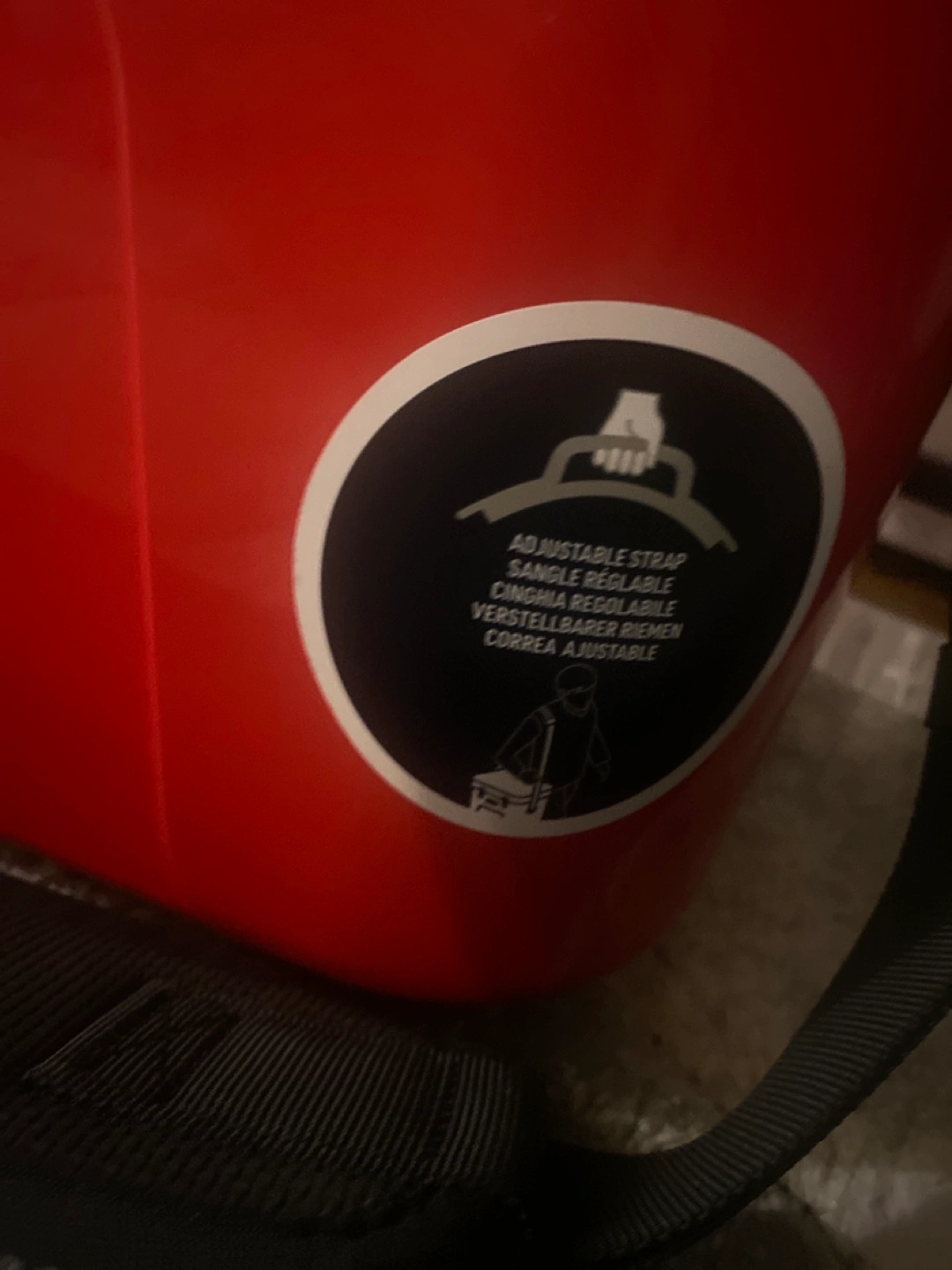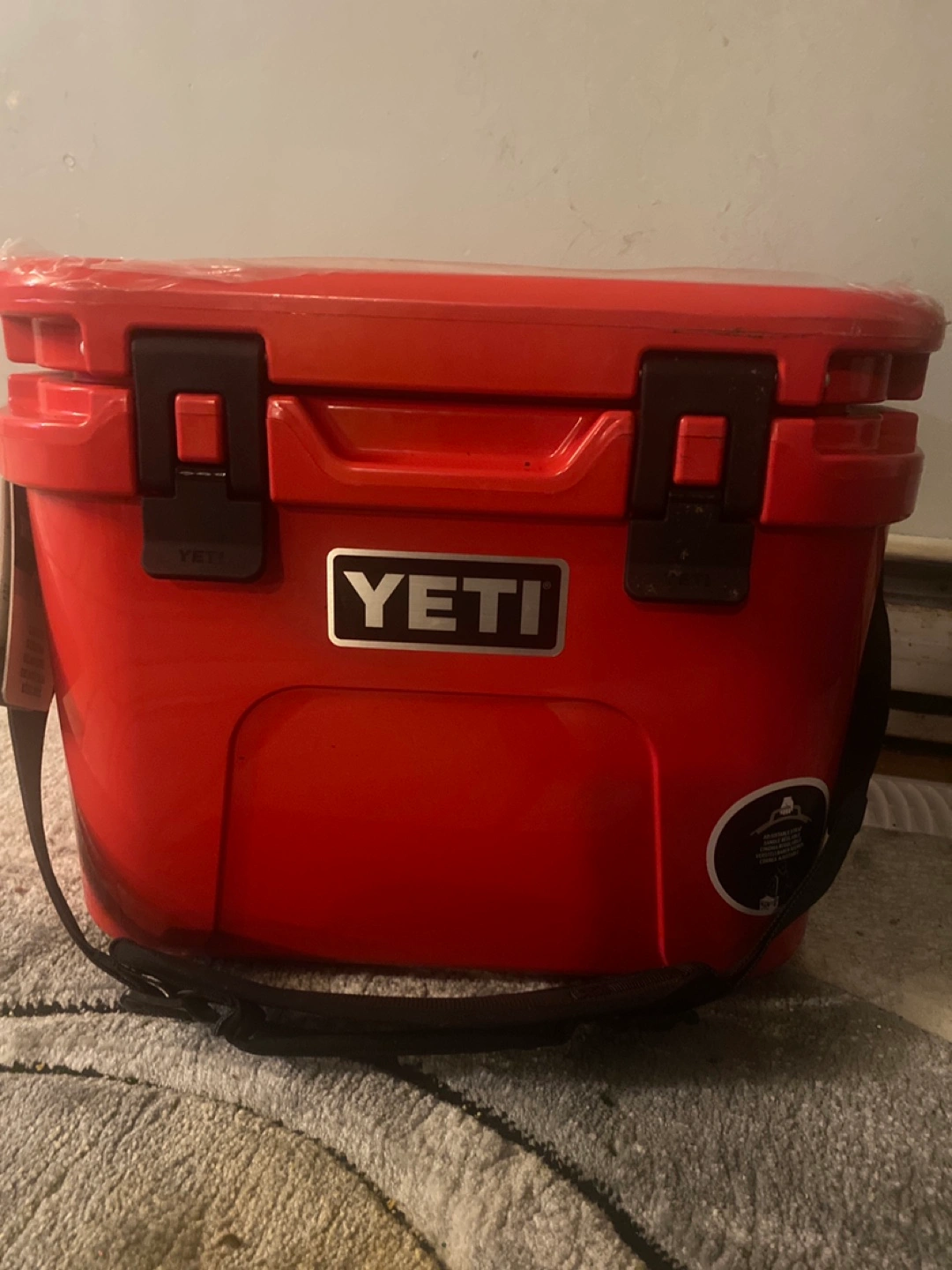 Red YETI Roadie 15 cooler with adjustable strap.