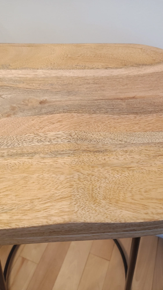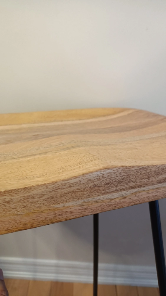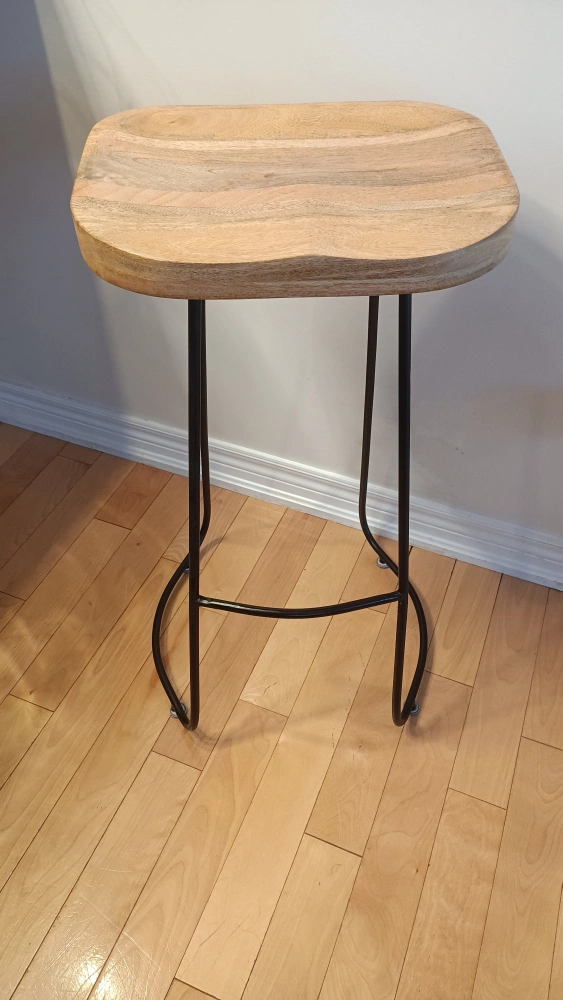 There are 2 identical stools. The seat has a butt groove/scooping (see last photo, it kind of shows) Sturdy metal legs, and foot rest. The whole thing is very sturdy and well built. Like new. Height approx 29 inches to the top of the seat, width 17.5 inches (widest spot at the base of the legs)