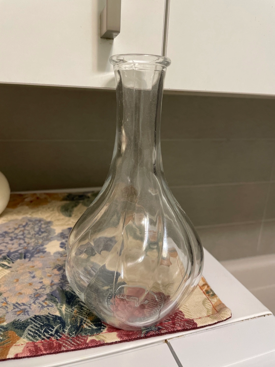 Ikea Clear glass vase with a bulbous body and a long neck. It is approximately 8 inches tall.