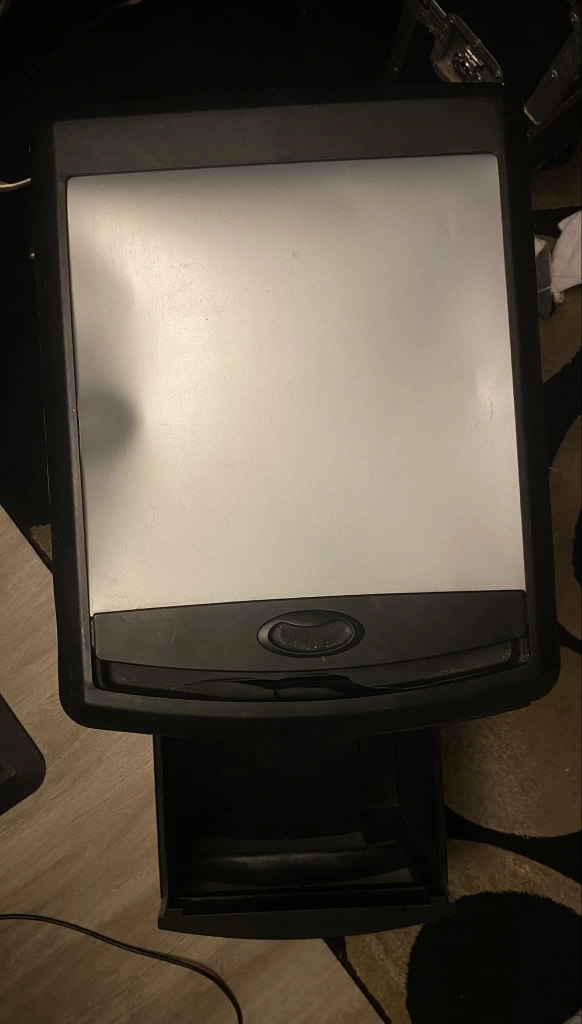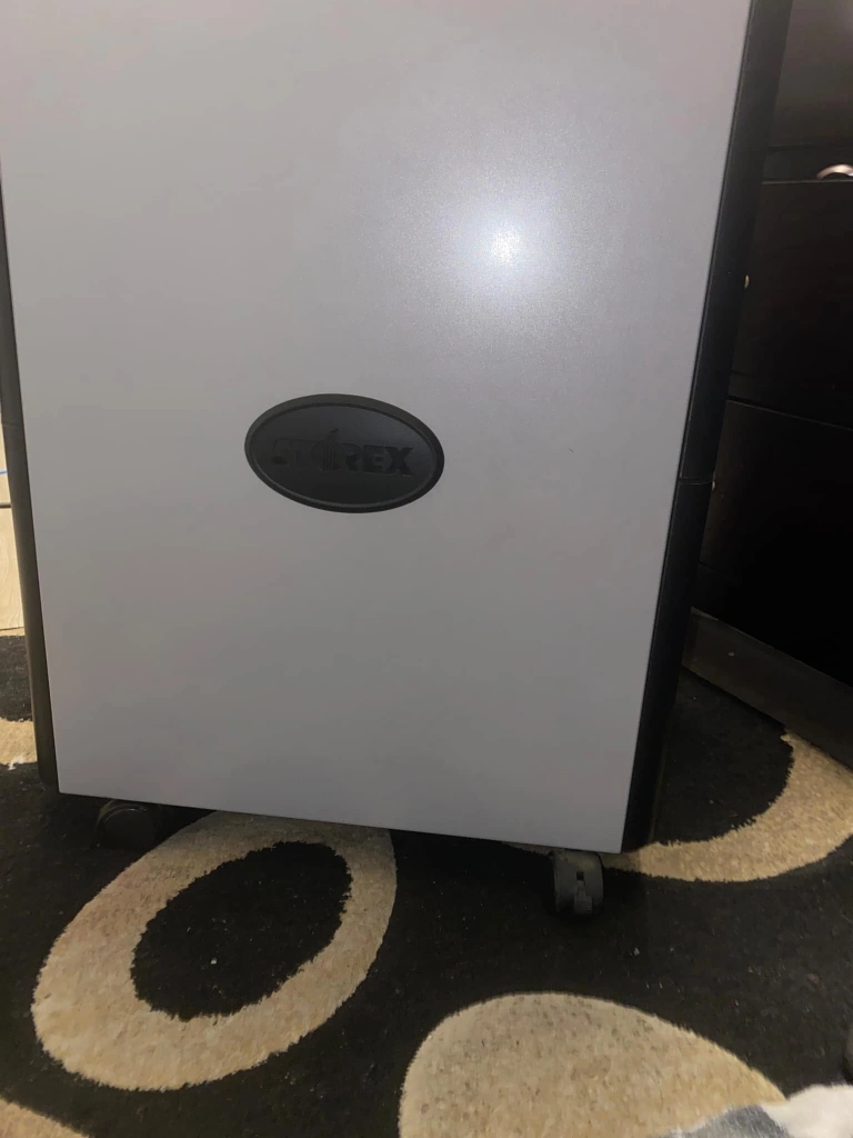 Two-drawer mobile file cabinet. Black with silver coloured drawers. It has wheels and a lock on one drawer. There is no key. It has had a heavy box on top, so a slight indentation . Typically sells for over 35 dollars.