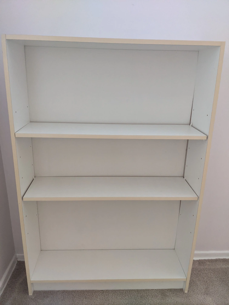 White bookcase with three shelves. Good for storing books or other household items.