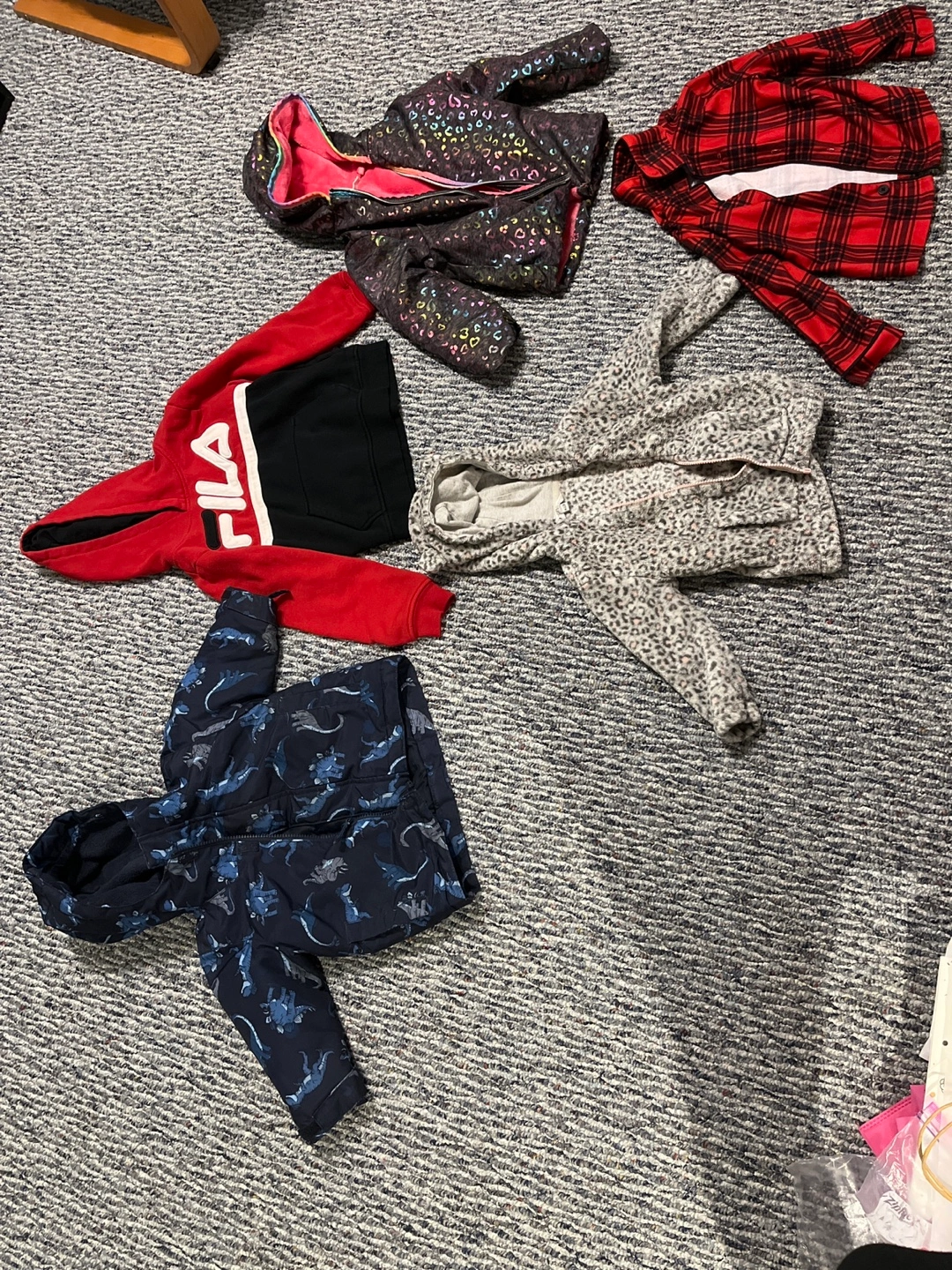 Bundle of 5 kids' clothes. Includes a red and black hoodie, a grey and white leopard print sweater, a red and black plaid shirt, a navy blue jacket with dinosaur print, and a black jacket with a pink and colourful pattern. Take all $25