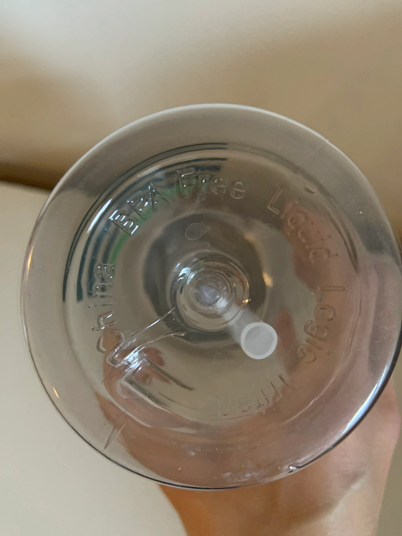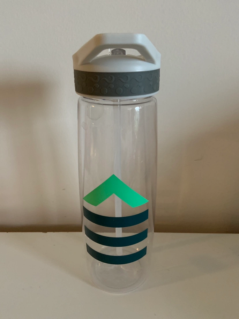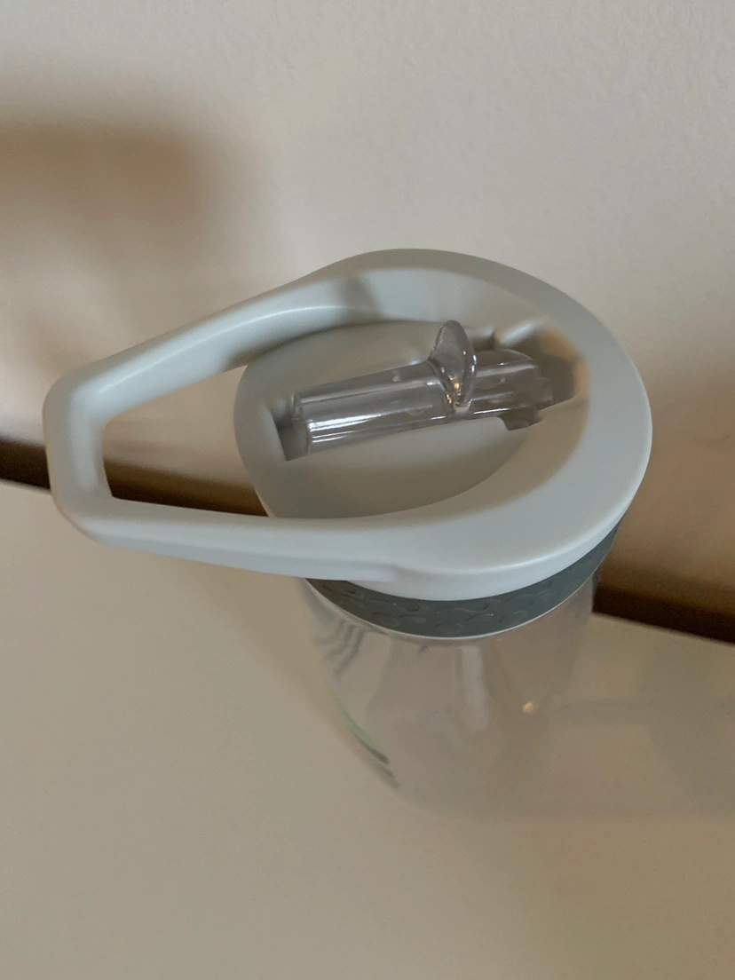 Clear plastic water bottle with a grey lid and carrying handle. It features a built-in straw and a green and blue mountain design. 750ml capacity BPA free
