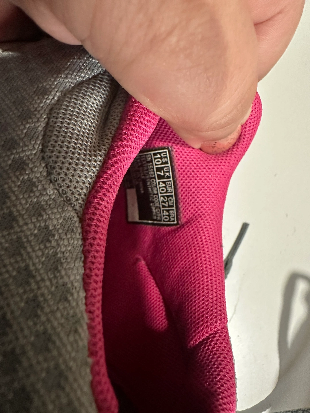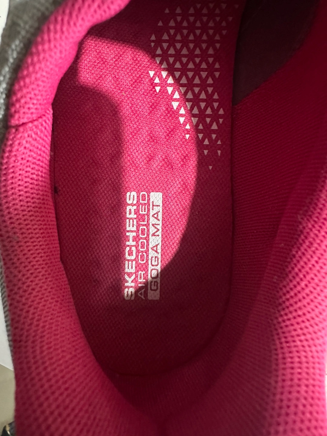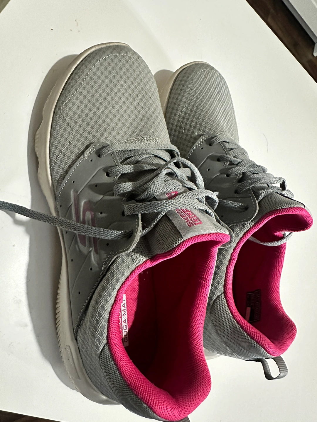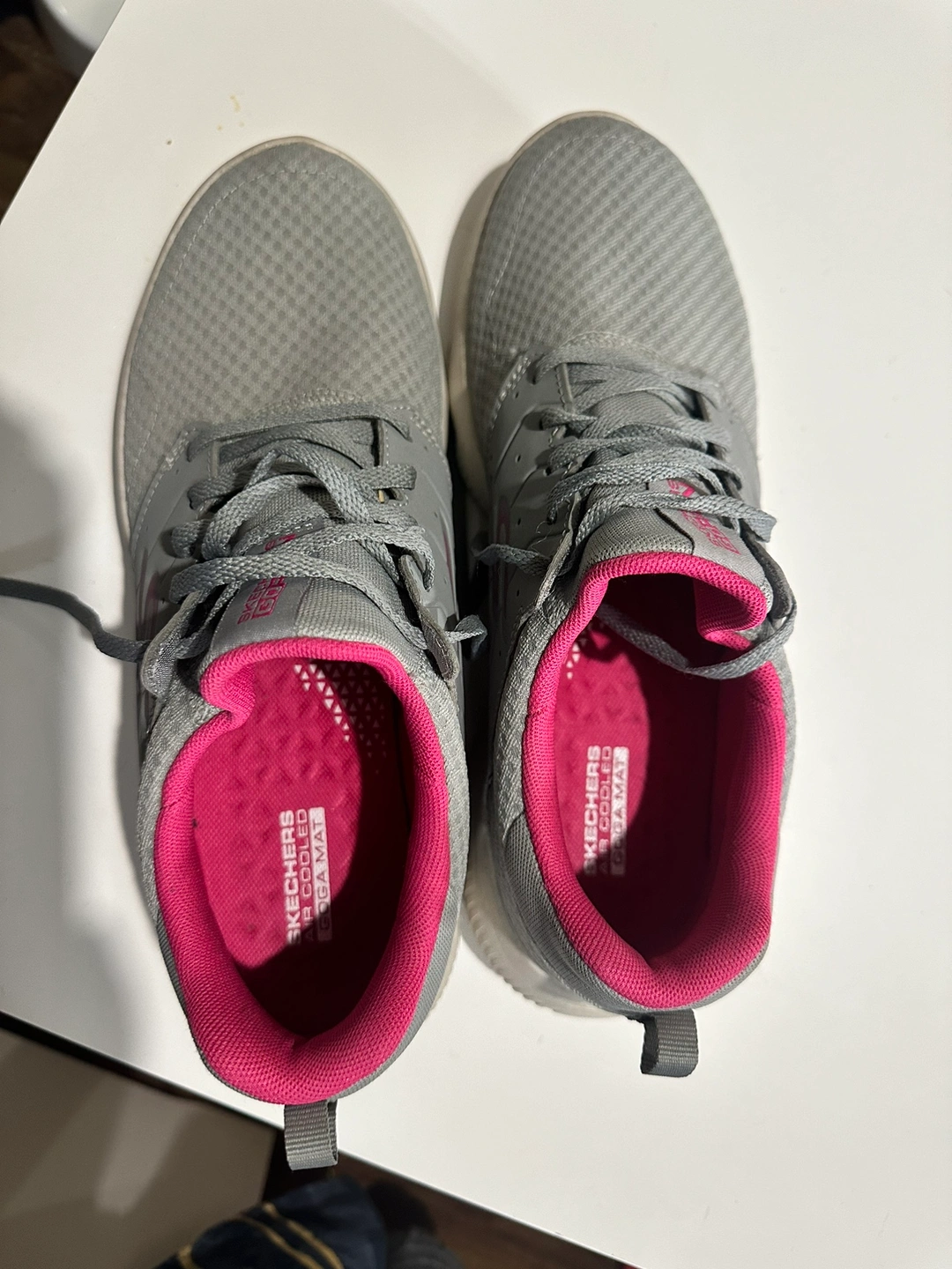 Grey running shoes with pink accents. Air cooled Goga Mat technology. Hardly worn. Pet free and smoke free home. Size US 10.
