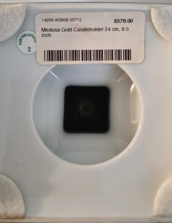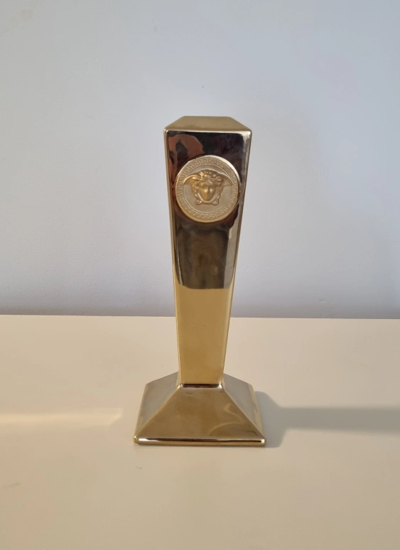 Gold ceramic candle holder with a Versace emblem.