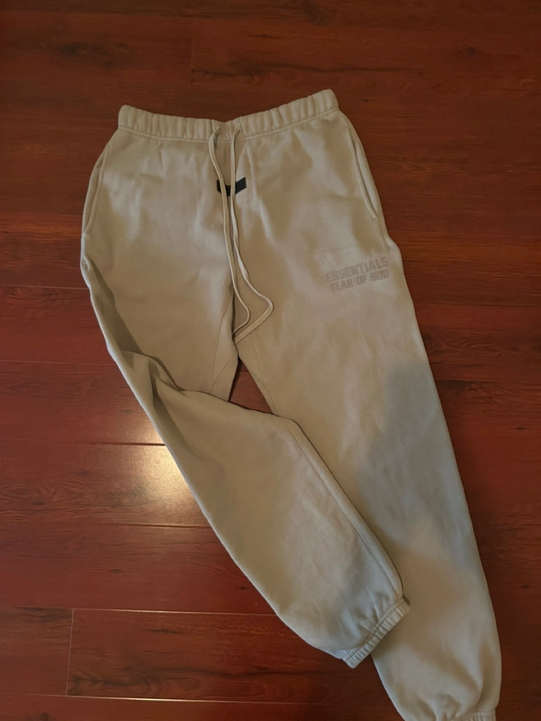 Beige sweatpants with elastic waistband and drawstring. Has two side pockets and one back pocket. Wore literally twice was too big for me. Your getting a good deal usually 170+ retail.