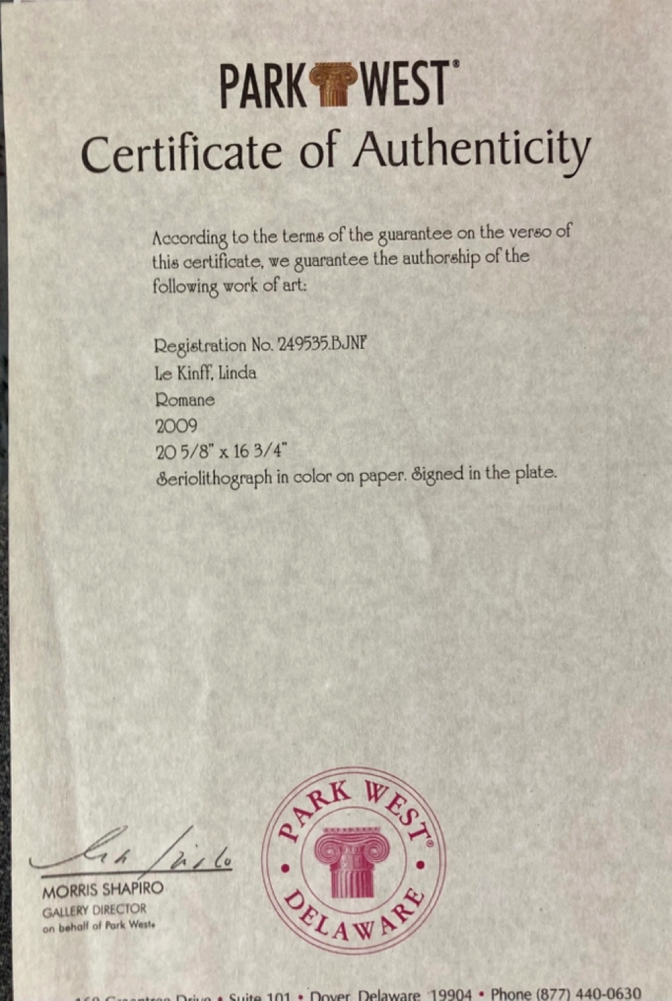6” Frame limited edition serigraph signed by the artist, Le Kinff. Comes with a certificate of authenticity from Park West Gallery. Excellent condition no damage.