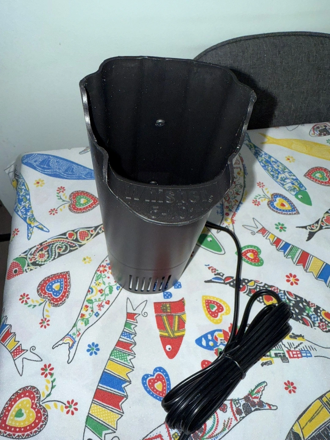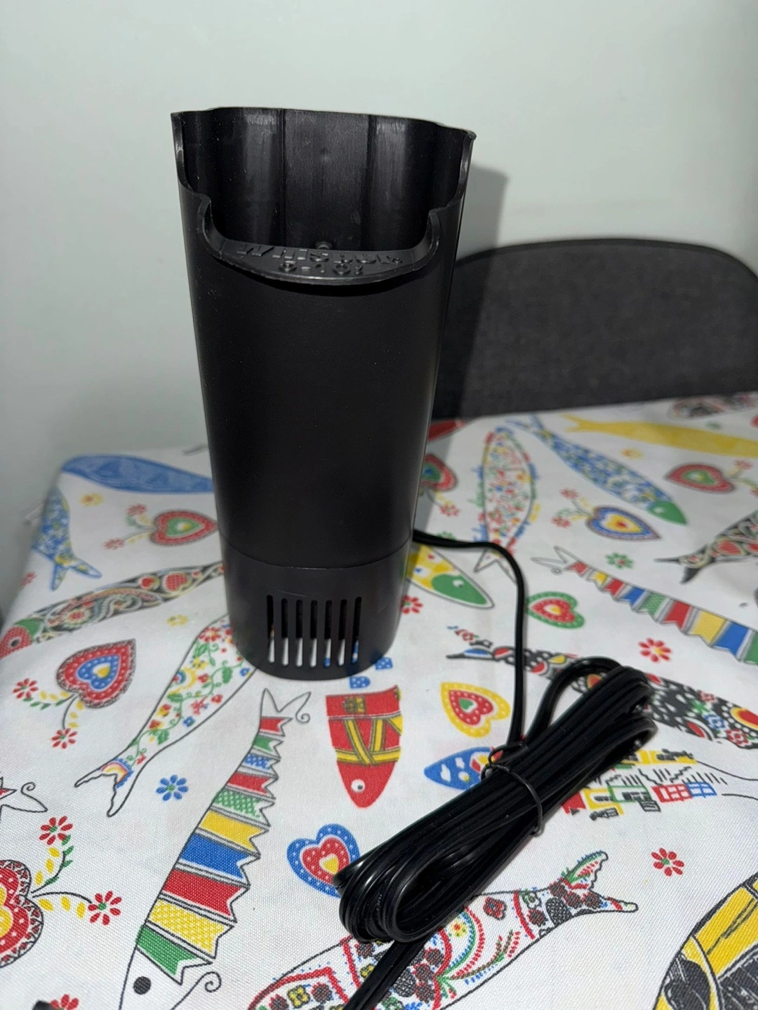 Black aquarium filter with a power cord. It includes a filter cartridge.
