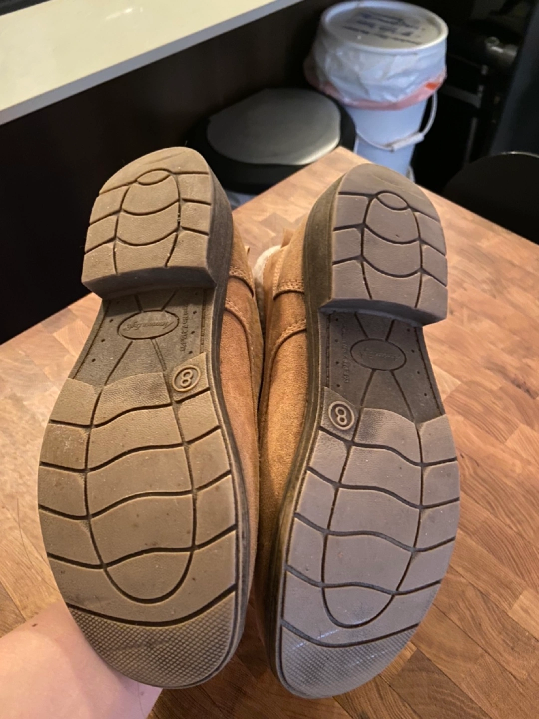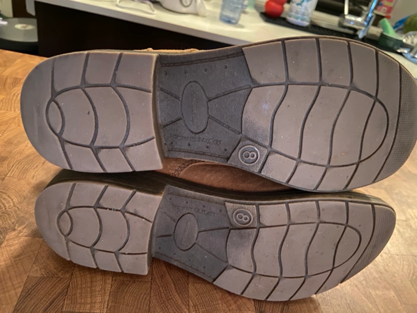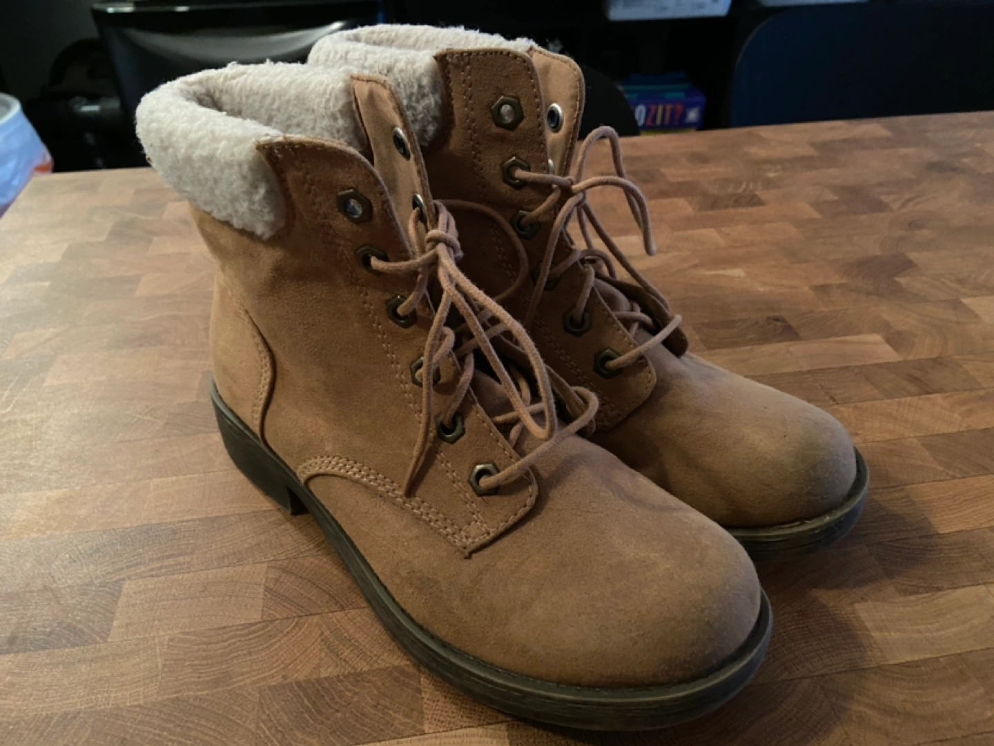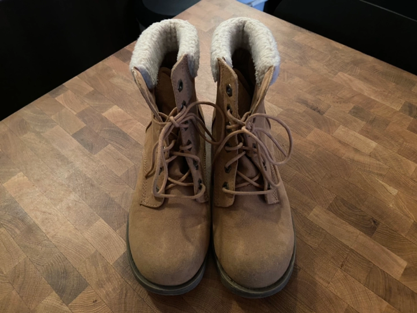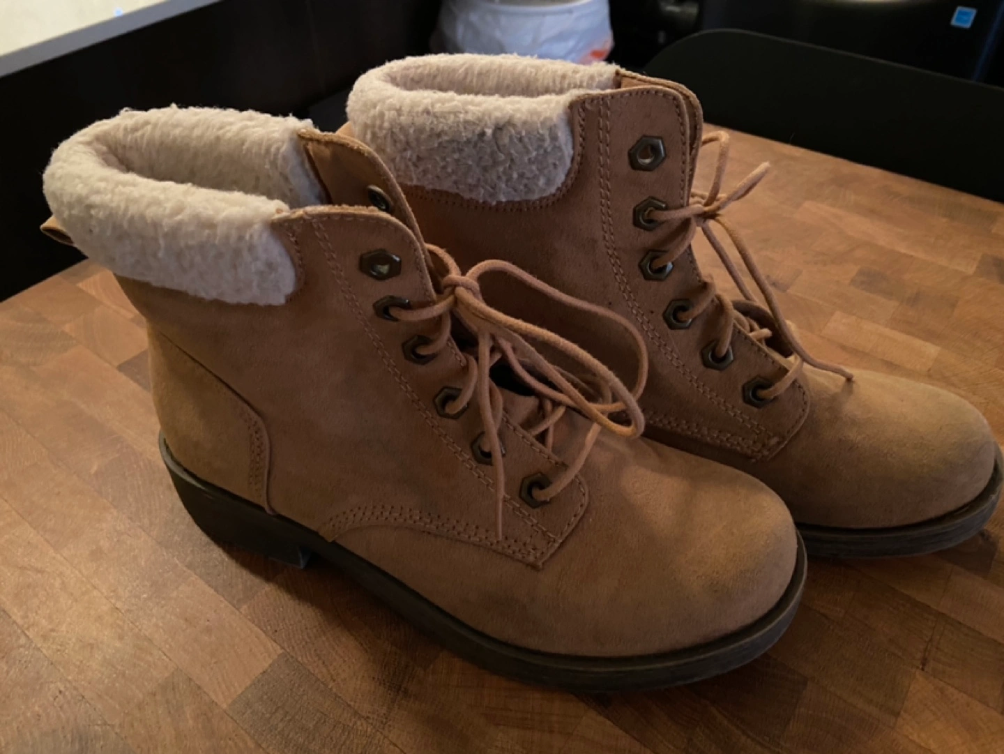 Brown suede boots with a lace-up closure and a faux fur lining. Size 8. Never worn. Very good condition.