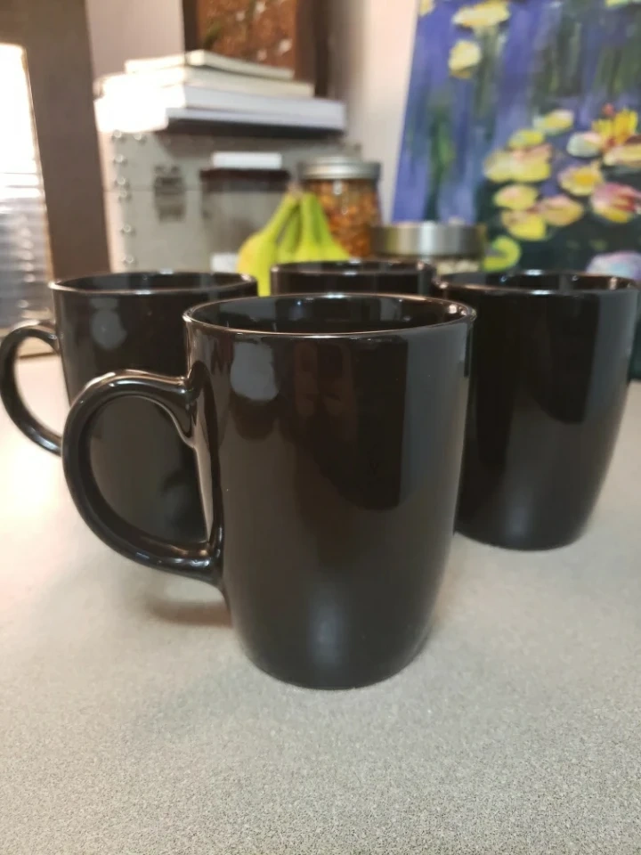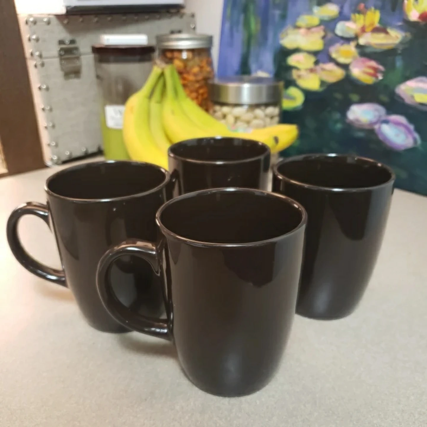 Set of 4 brown coffee mugs. Microwave and dishwasher safe.