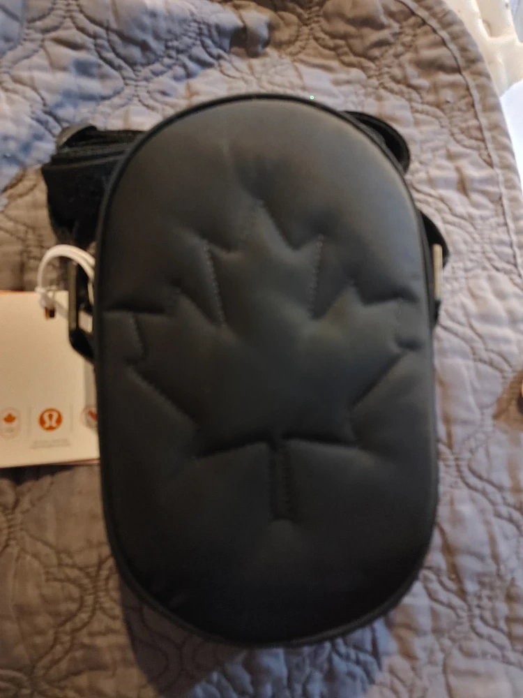 Black quilted crossbody bag with a maple leaf design. Features an adjustable strap. 8"x5"x2 Pick up Yonge and Finch area