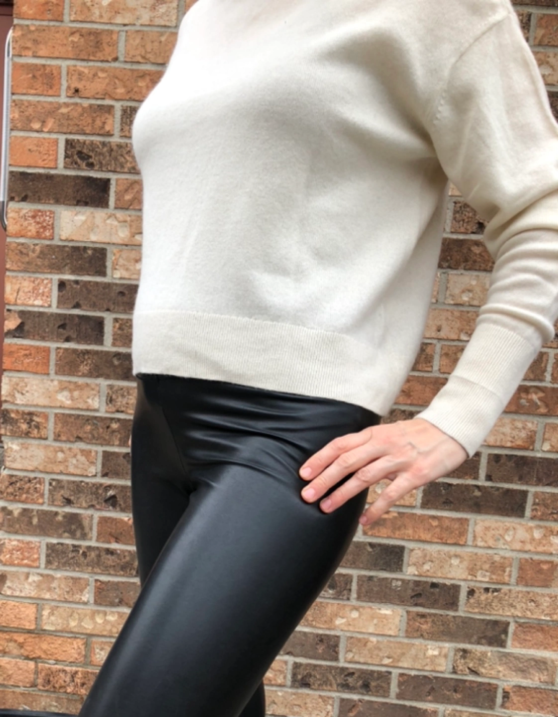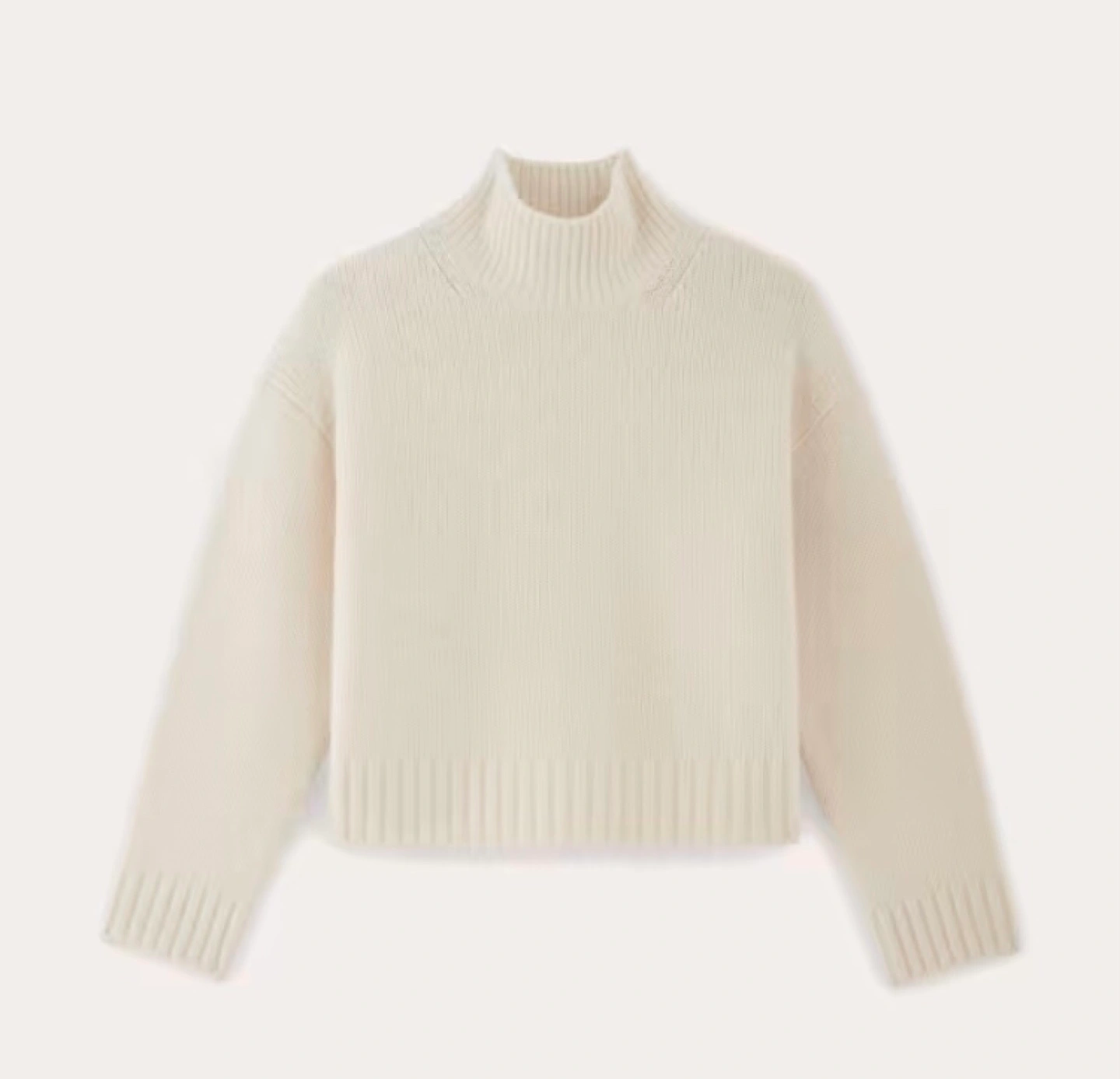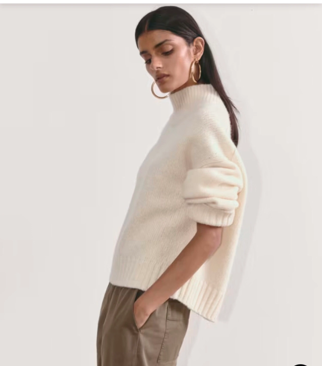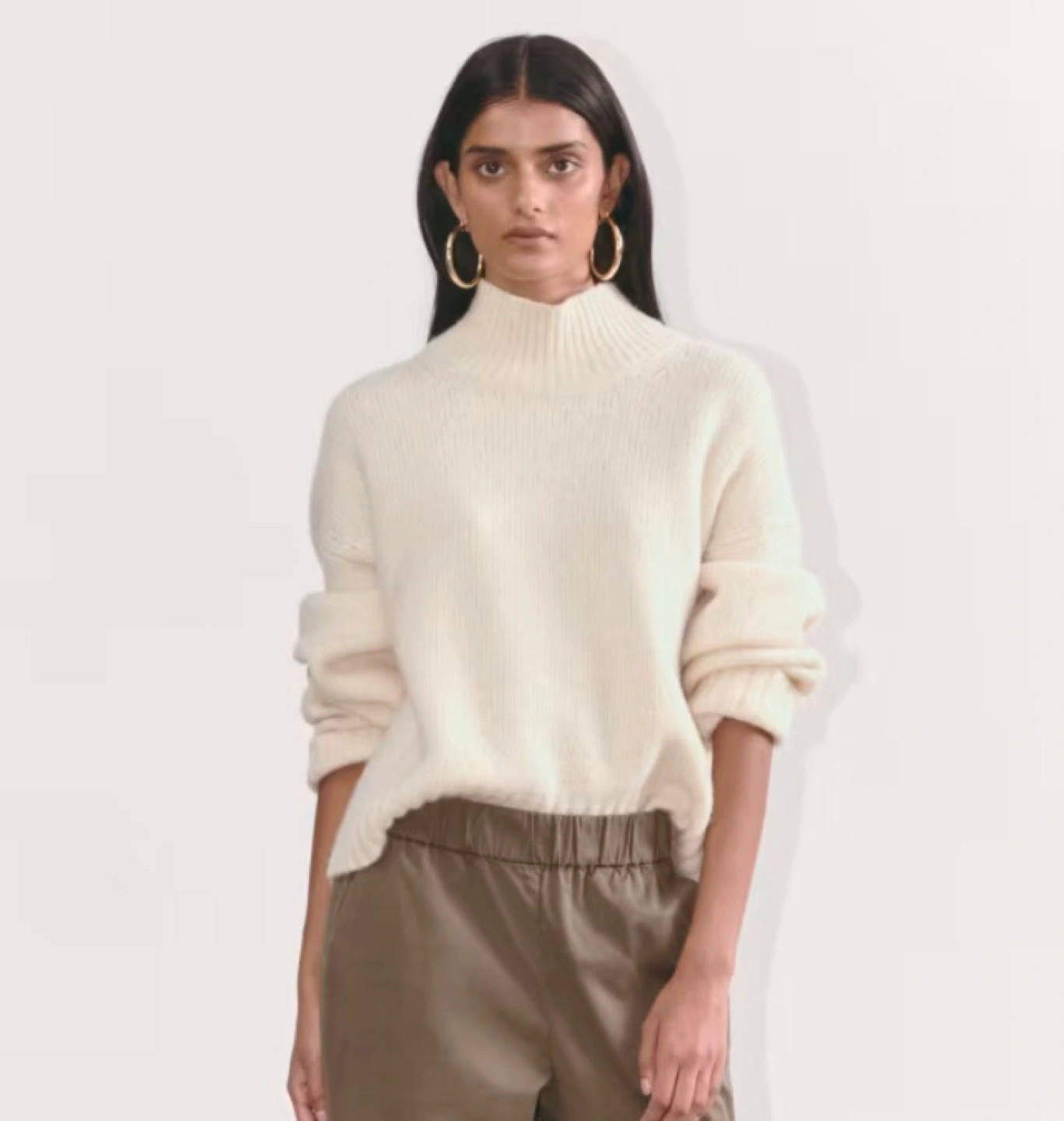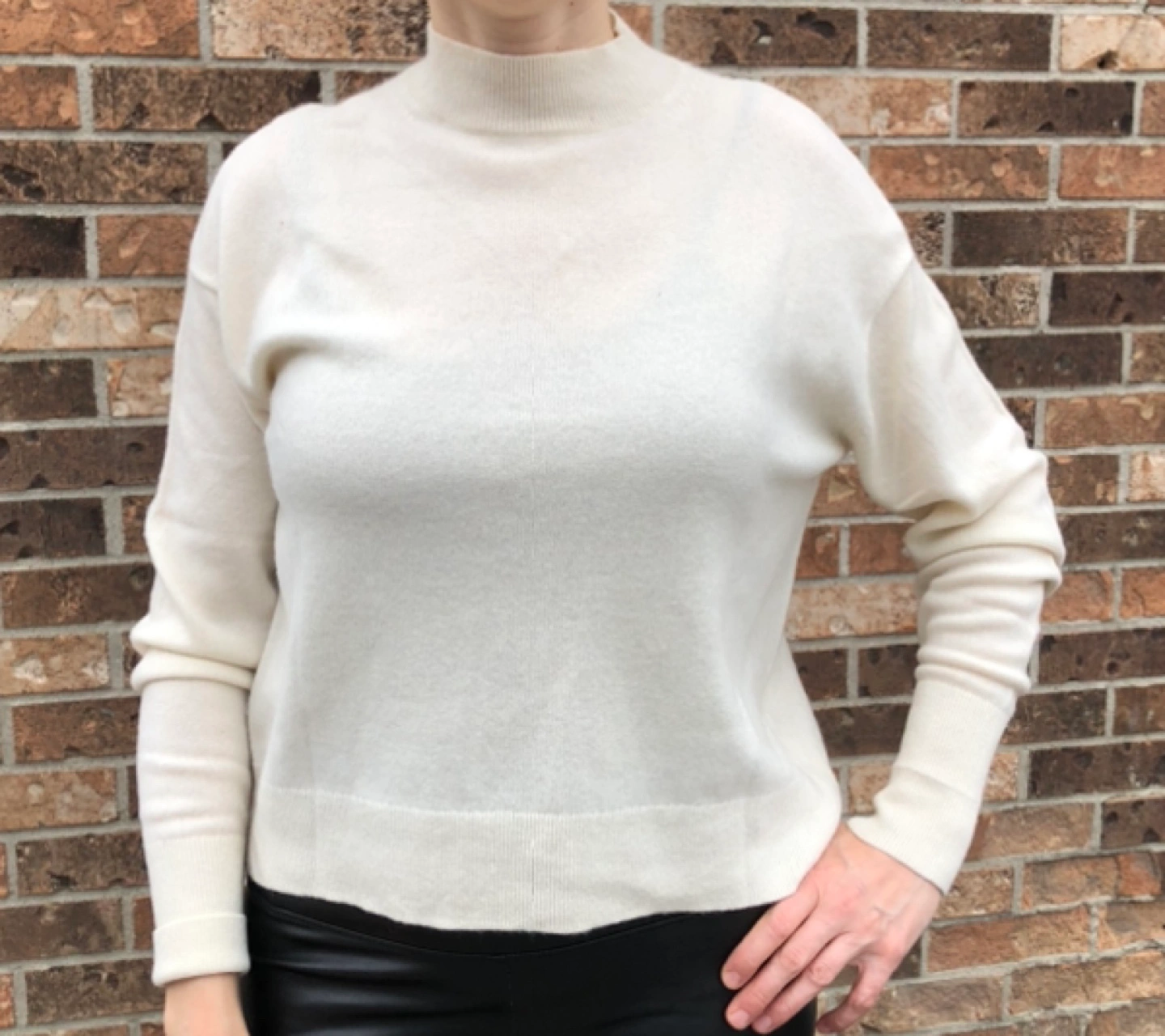100% cashmere mock neck sweater. Long sleeves. Relaxed fit.