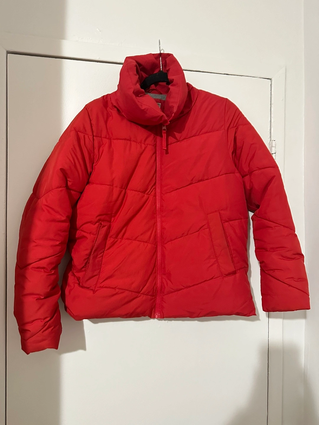 Red puffer jacket with a high collar and zipper closure. Long sleeves. M Bathrobe L
