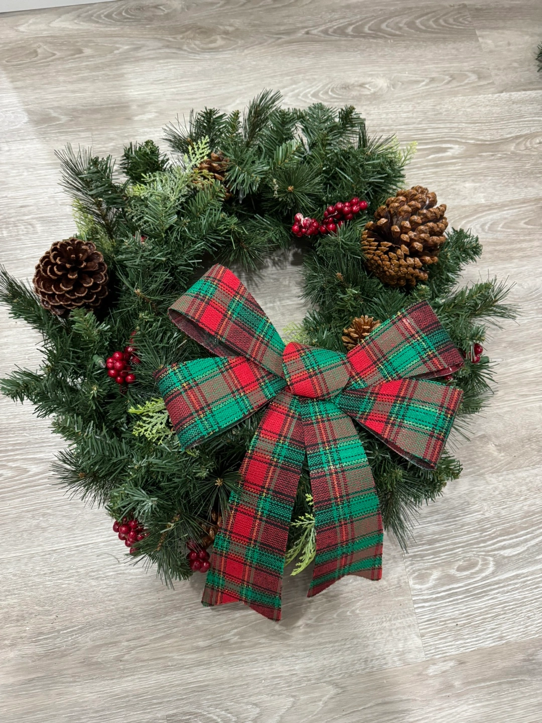 Green wreath with red berries and pine cones. Decorated with a plaid bow.