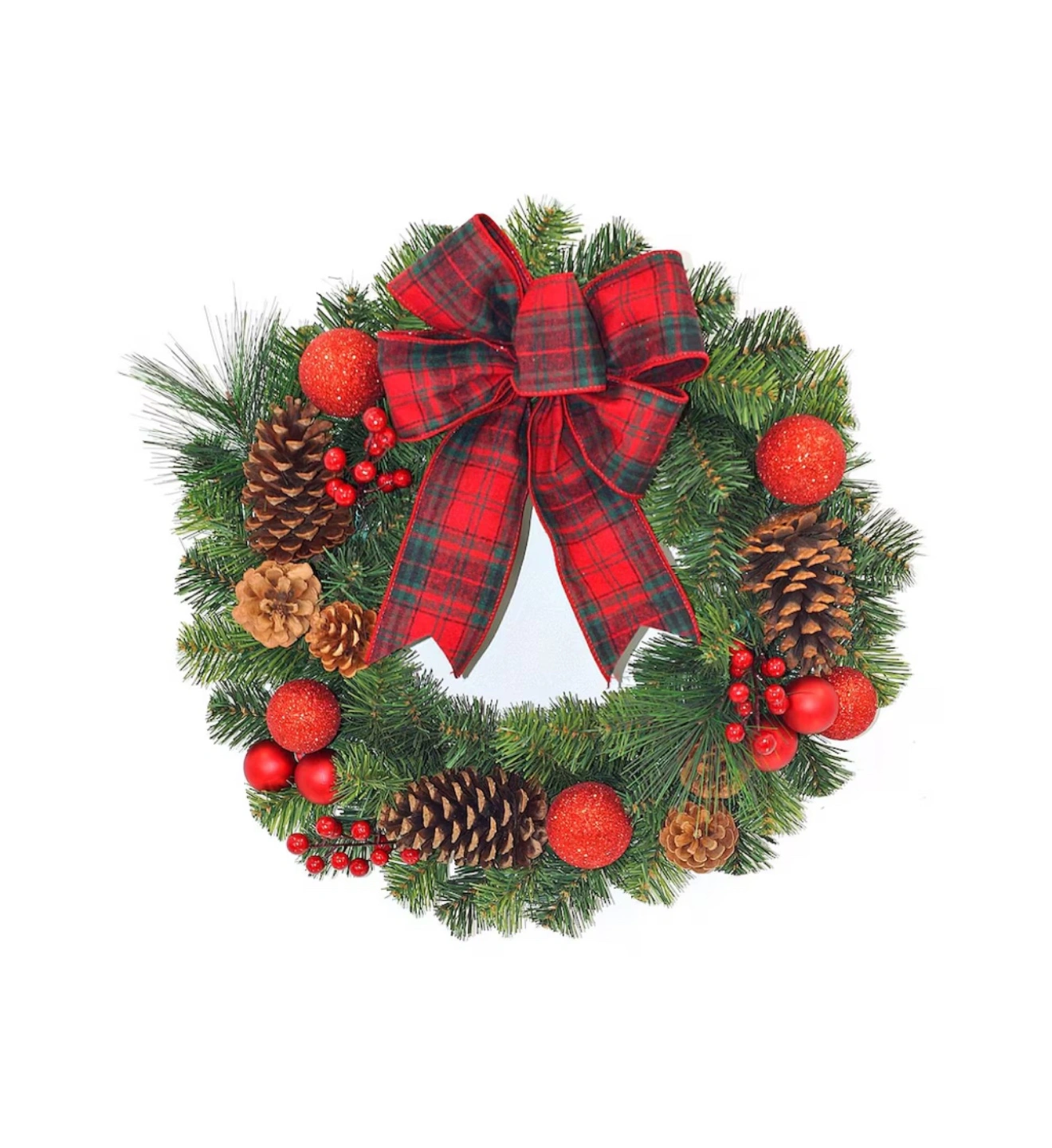 Wreath with red ornaments and a plaid bow.