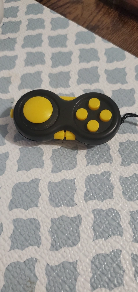 small black and yellow fidget clicker with buttons, joy stick , switches...etc