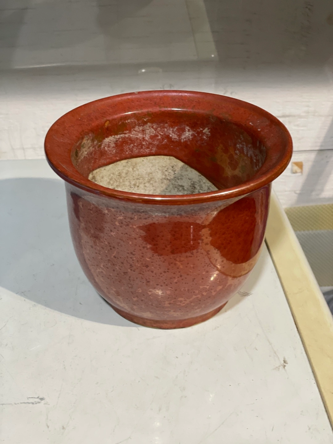 Orange brown ceramic plant pot with a saucer. 7.5 inches diameter by 6 inches high.