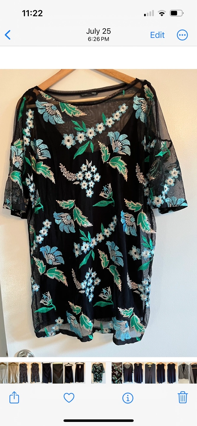 Black mesh dress with embroidered floral details. Short sleeves with a loose fit.