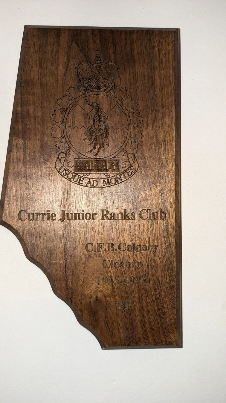 Wooden plaque with engraved text and logo. Includes the text "Currie Junior Ranks Club", "C.F.B. Calgary Closure 1935-1997", and a logo with a crown and the text "CALGARY USQUE AD MONTES". This is a unique piece of Calgary and Military History. The plaque is in the shape of our great province of Alberta This has never been hung on a wall. I have always stored it carefully in a box. Thank you for looking at our listing. We always welcome questions . From a smoke-free home.