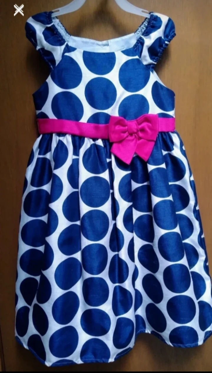 Girl's size 5X white dress with large navy blue polka-dots and pink bow. Dress comes with attached slip and crinoline and is in excellent condition. Brand name Cherokee. Age: 5 - 7 years