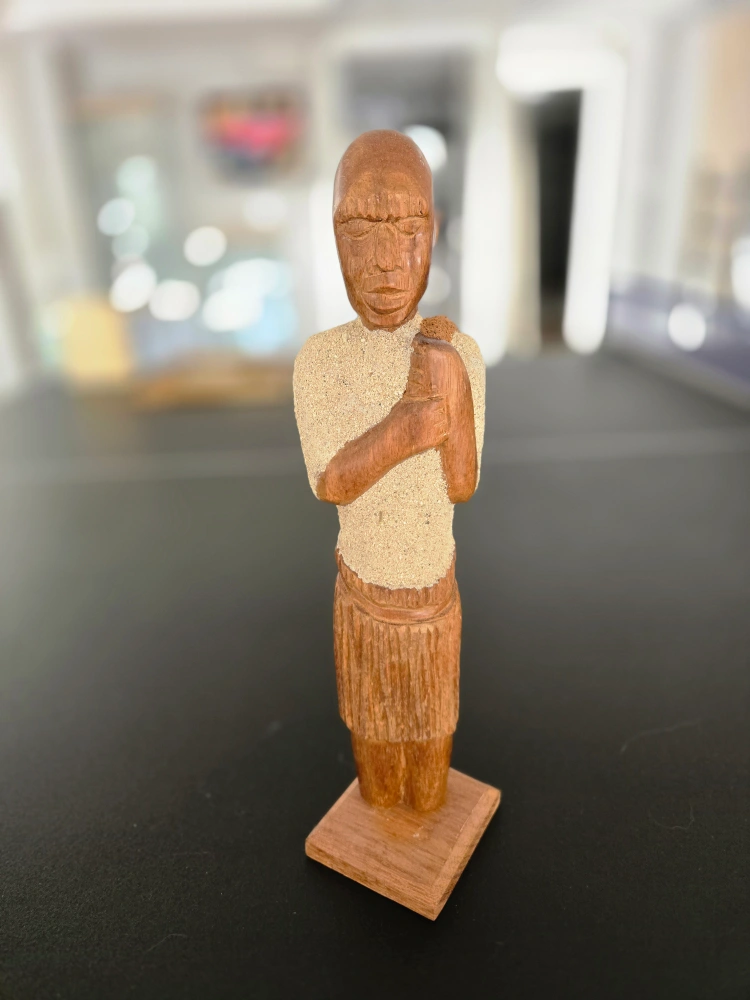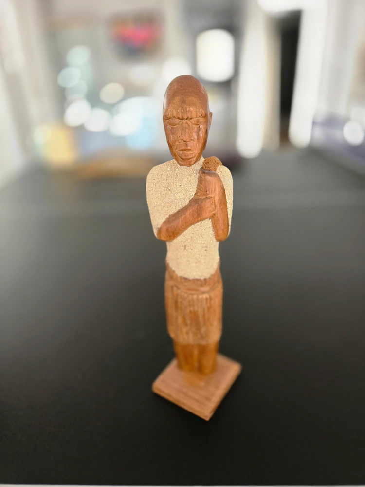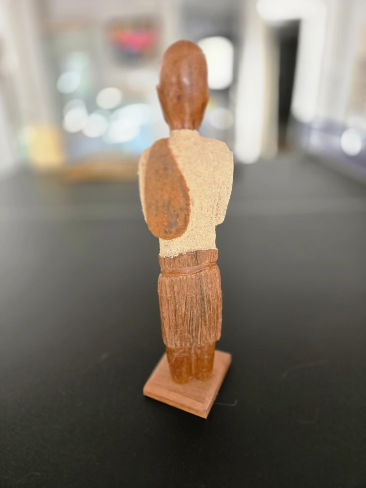Hand-carved- wooden figurine of a person. Made of dark wood and Sand