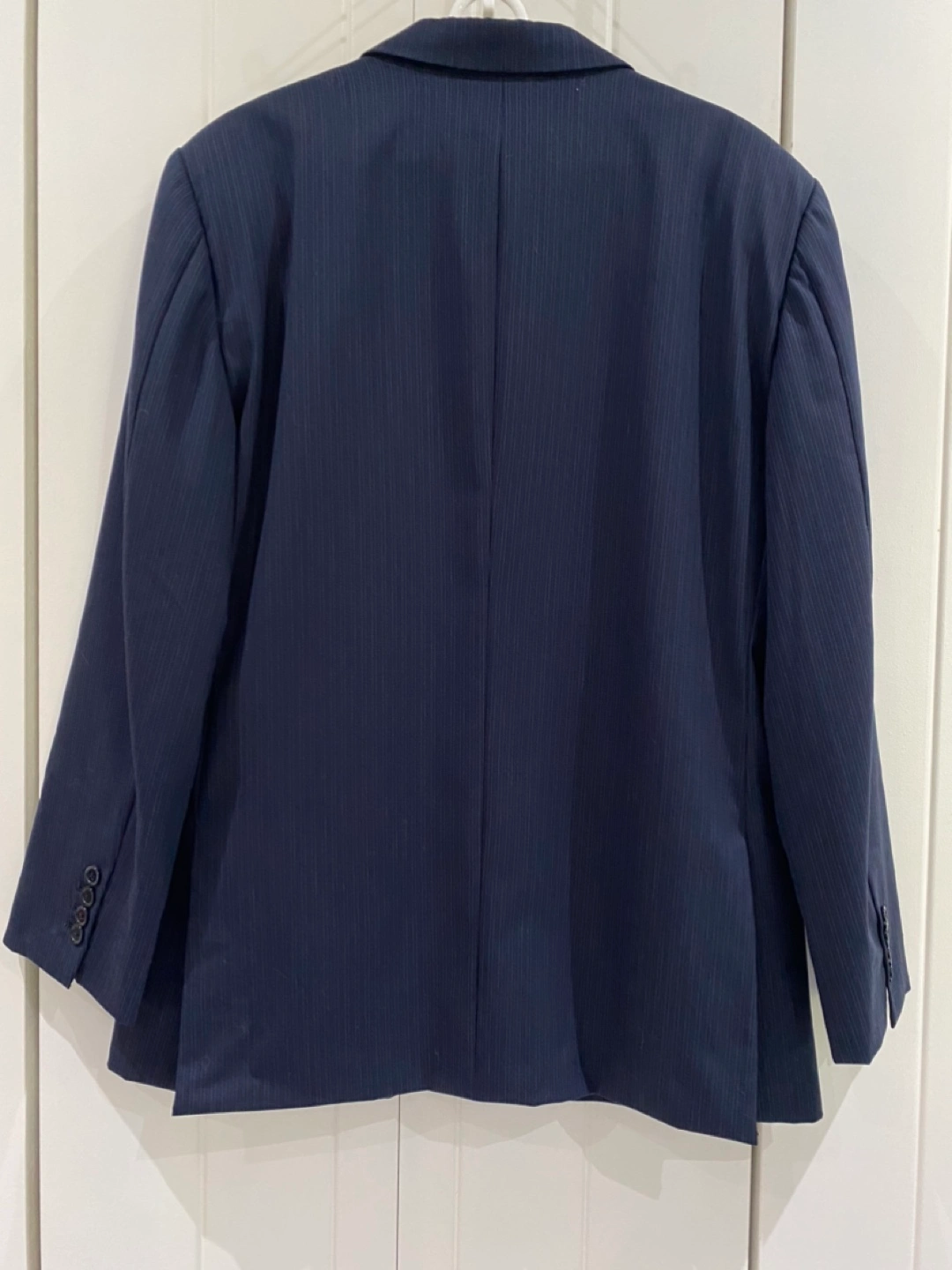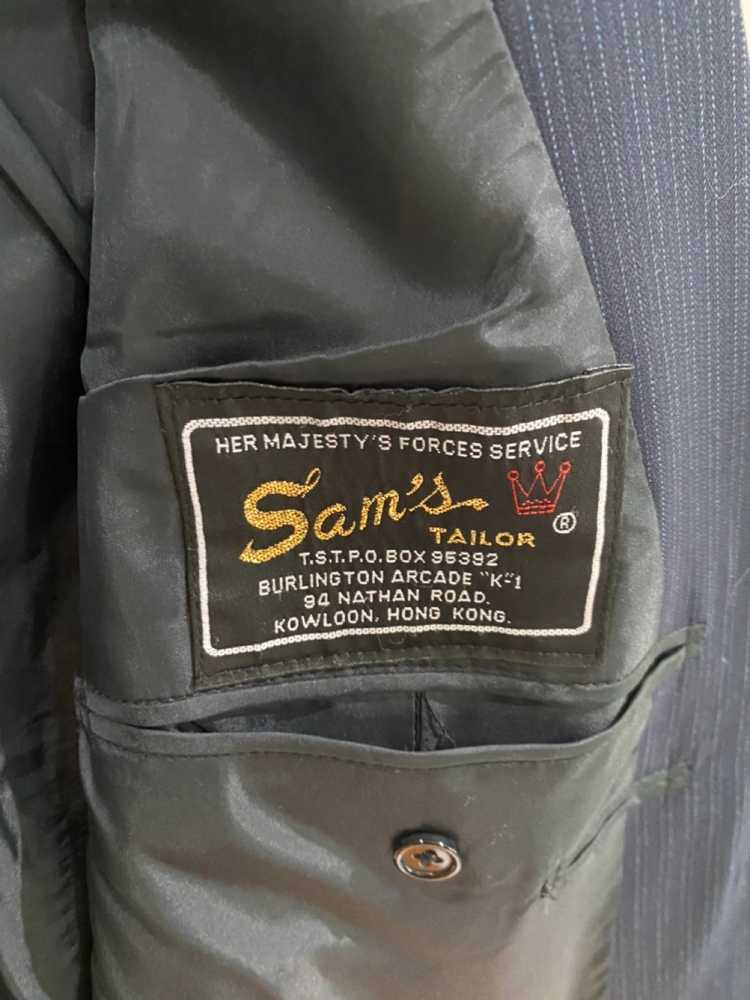 Navy blue blazer with pinstripes. Two button closure. Long sleeves with button cuffs. Two front pockets and one breast pocket. Lined. One of Hong Kong's longest standing bespoke tailors, Sam's Tailor has a tradition of fine tailoring. Having been passed through the generations and been in the same location since the store opened in 1957. Sam's is well known for their fine quality service, fabrics, and discretion, as well as, a clientele from the pages of the International Who's Who. Our location is in one of the most iconic cities on the globe and it is a rolling red-carpet to the patronage of Royalty, Presidents, Prime-ministers and widely assorted celebrities. Gently worn — no damage. Shoulders 19.5” P2P 22.2” Sleeves 25” Length back 31.25”