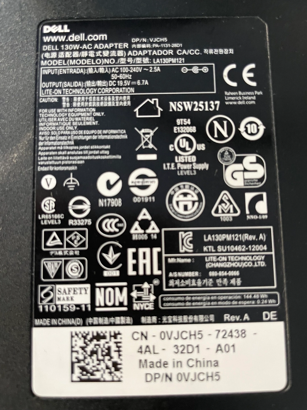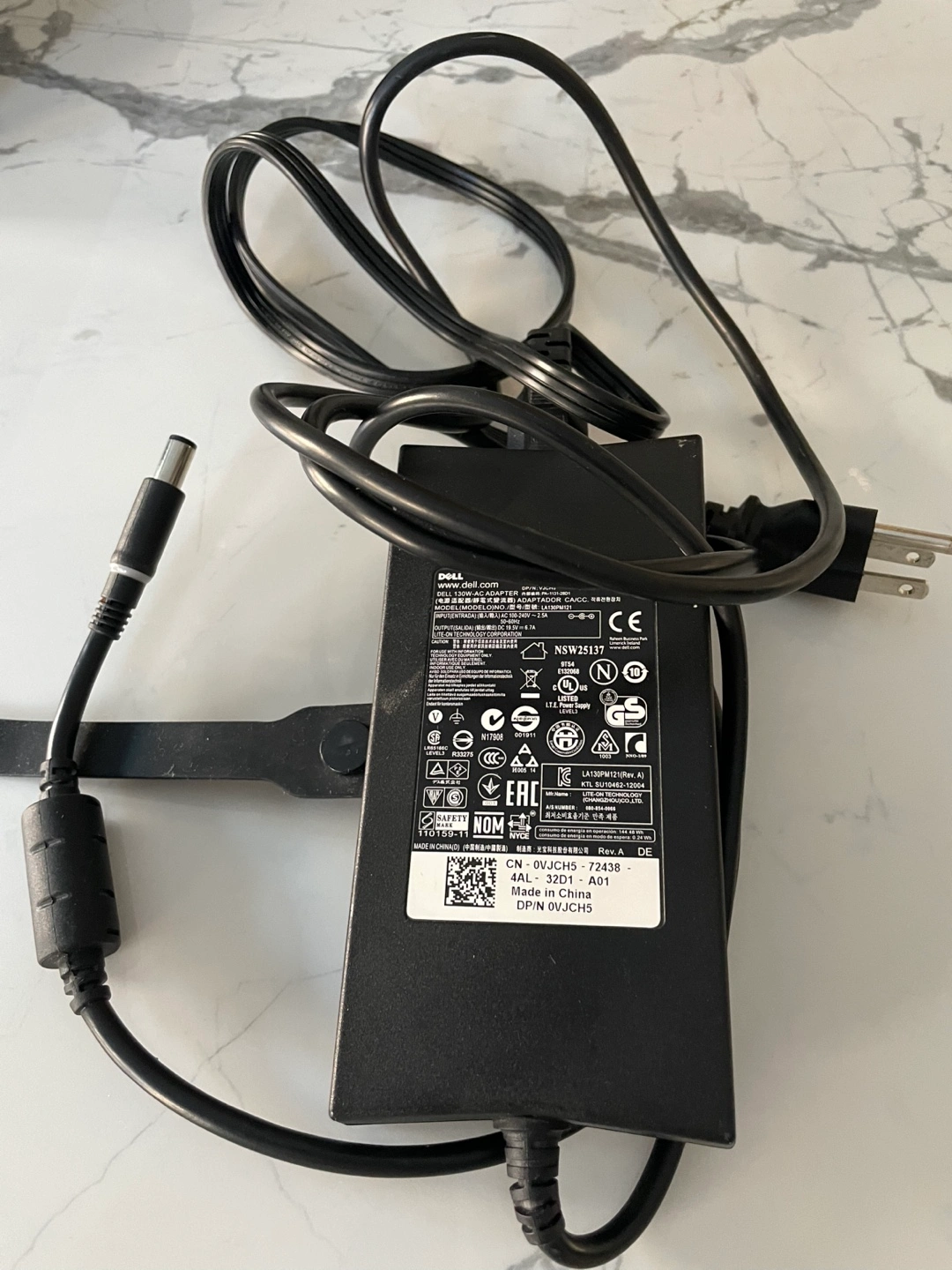 Dell 130W AC adapter. Black. Comes with power cord.