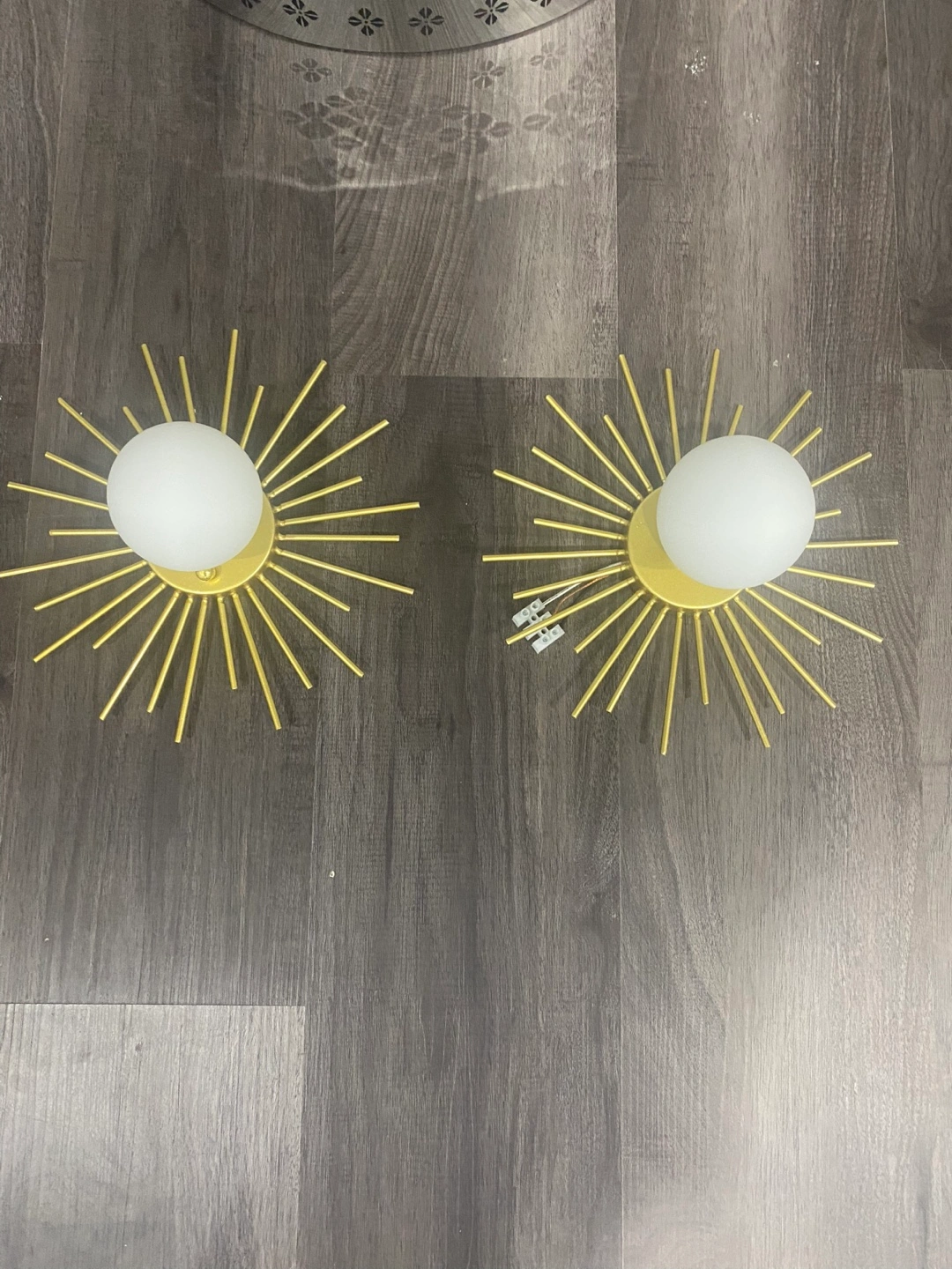 Set of 2 gold sunburst wall sconces light. Each sconce features a round white globe light fixture. 2x night lights Each of them $30 Total $60