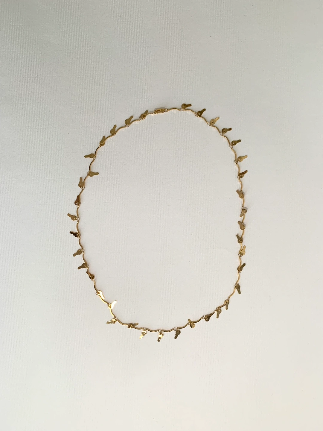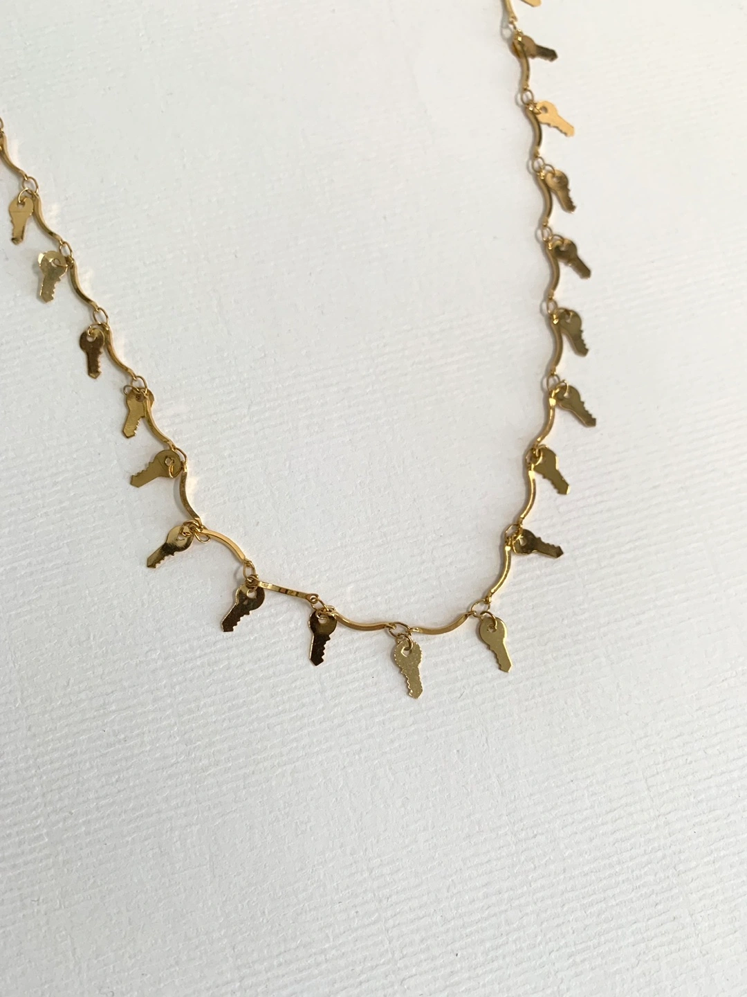 Gold key necklace with multiple key charms. The necklace has a wavy chain. Length is 24”.