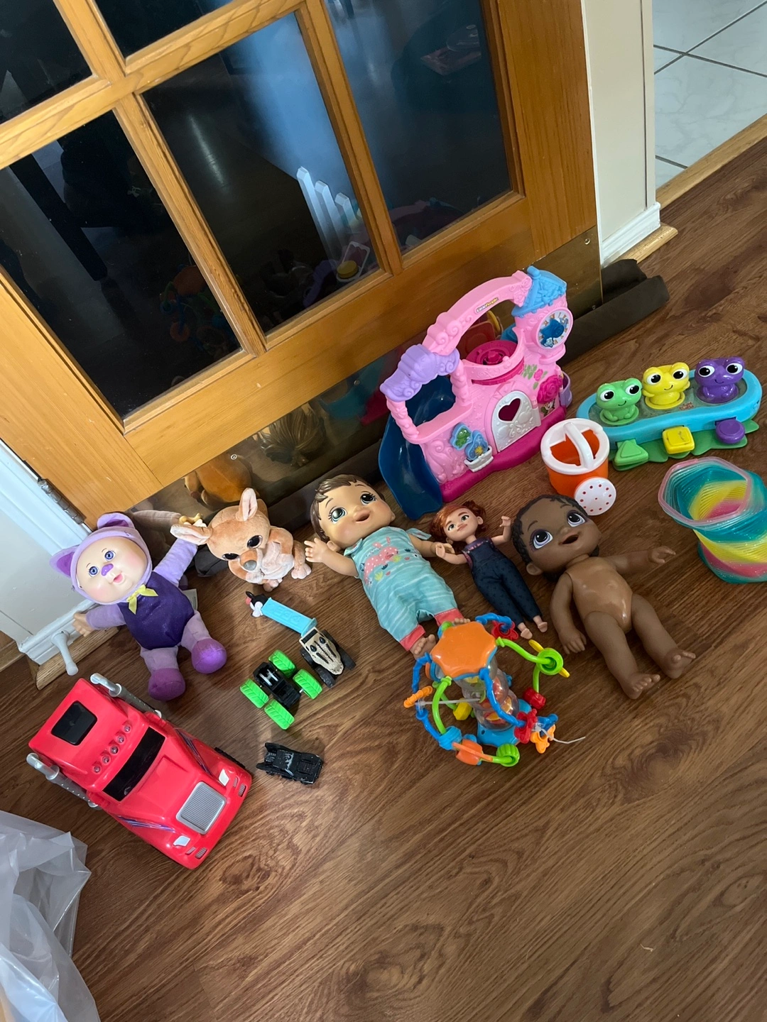 A collection of baby toys including dolls, a playhouse, a toy truck, a baby gym, and more. Please make me an offer.