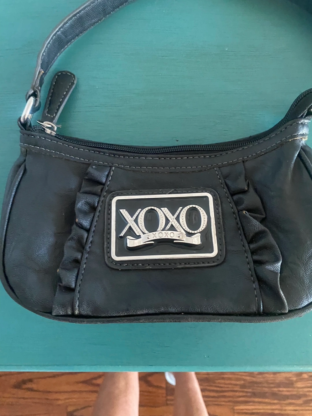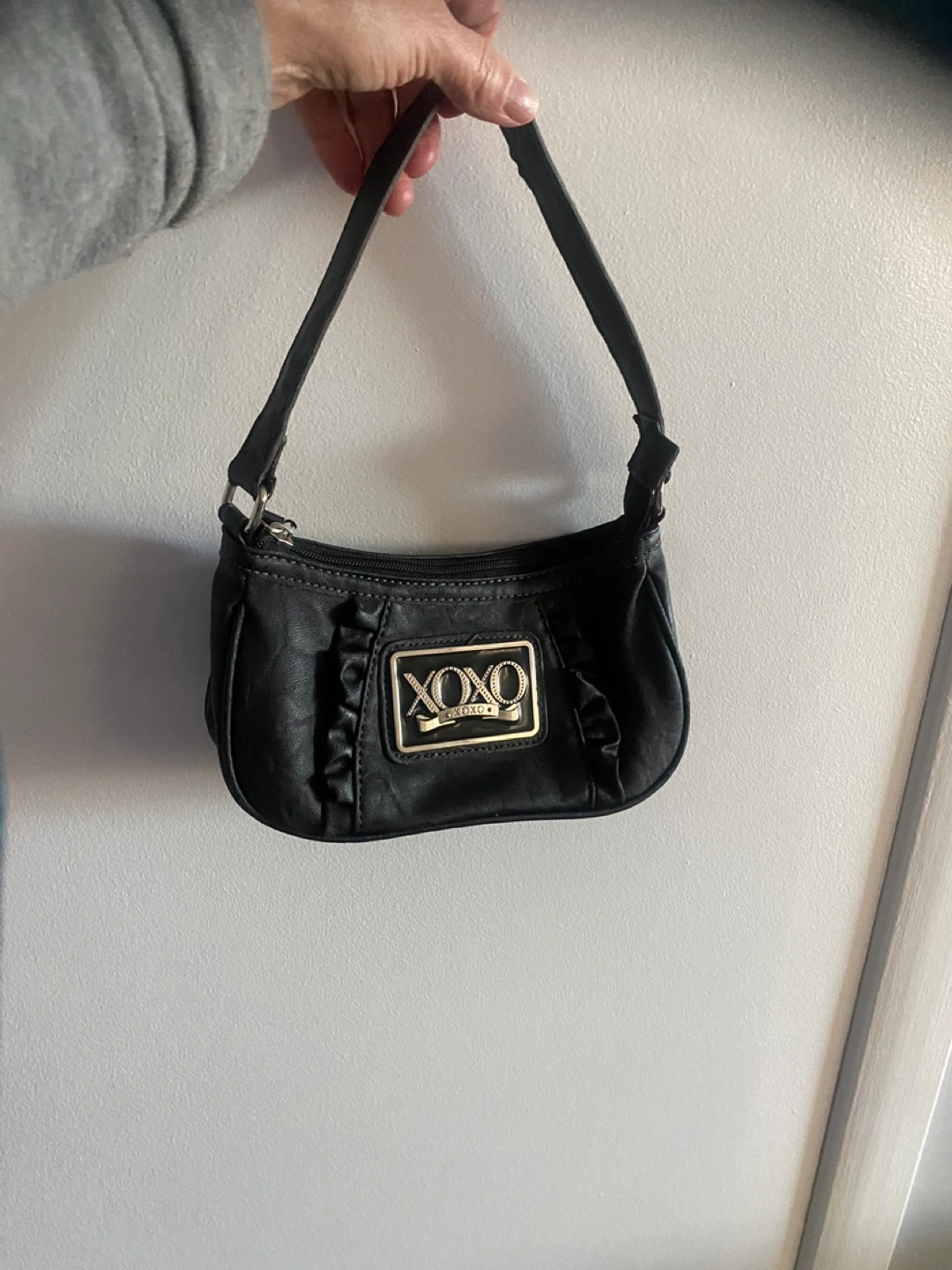 Black mini handbag with a silver XOXO logo. Features a zipper closure and a small, ruffled detail on the front.