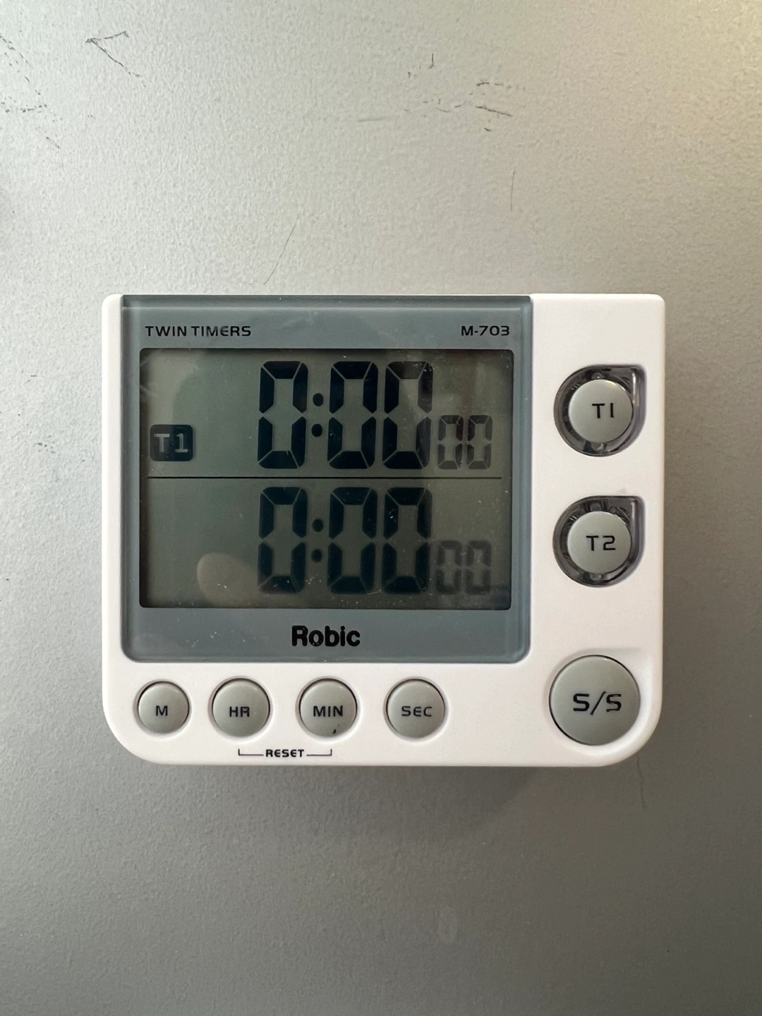 98.9% Like New - Dual timers with count up and countdown functions - Hour-minute-second setting from 99 hours 59 minutes 59 seconds - 3 alarm options - Silent, Regular or Extra Loud - Jumbo LCD, big digit dual display Handheld, tabletop stand, wall mount or wall magnet - Color: White Grey The price listed does not include batteries.