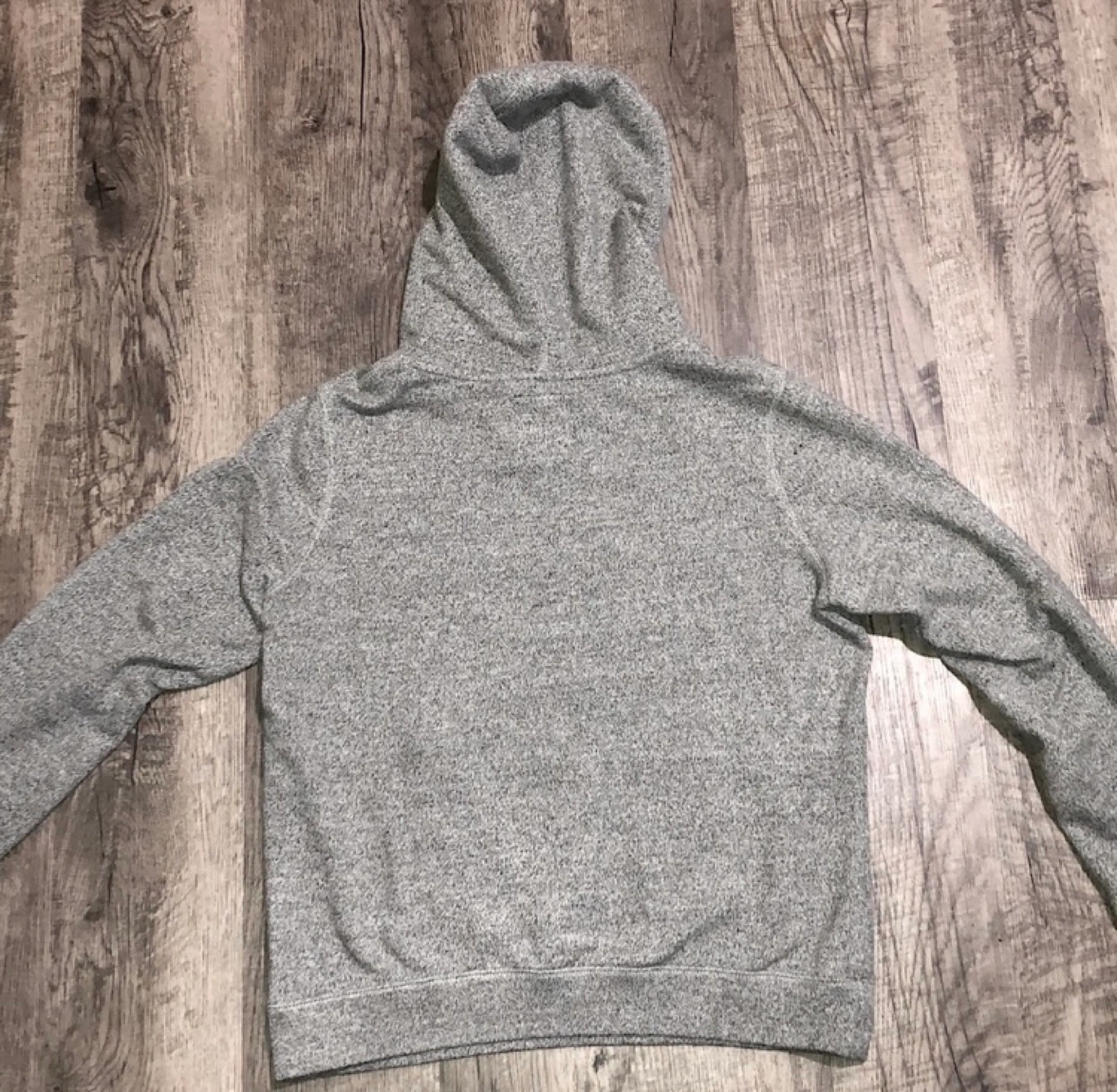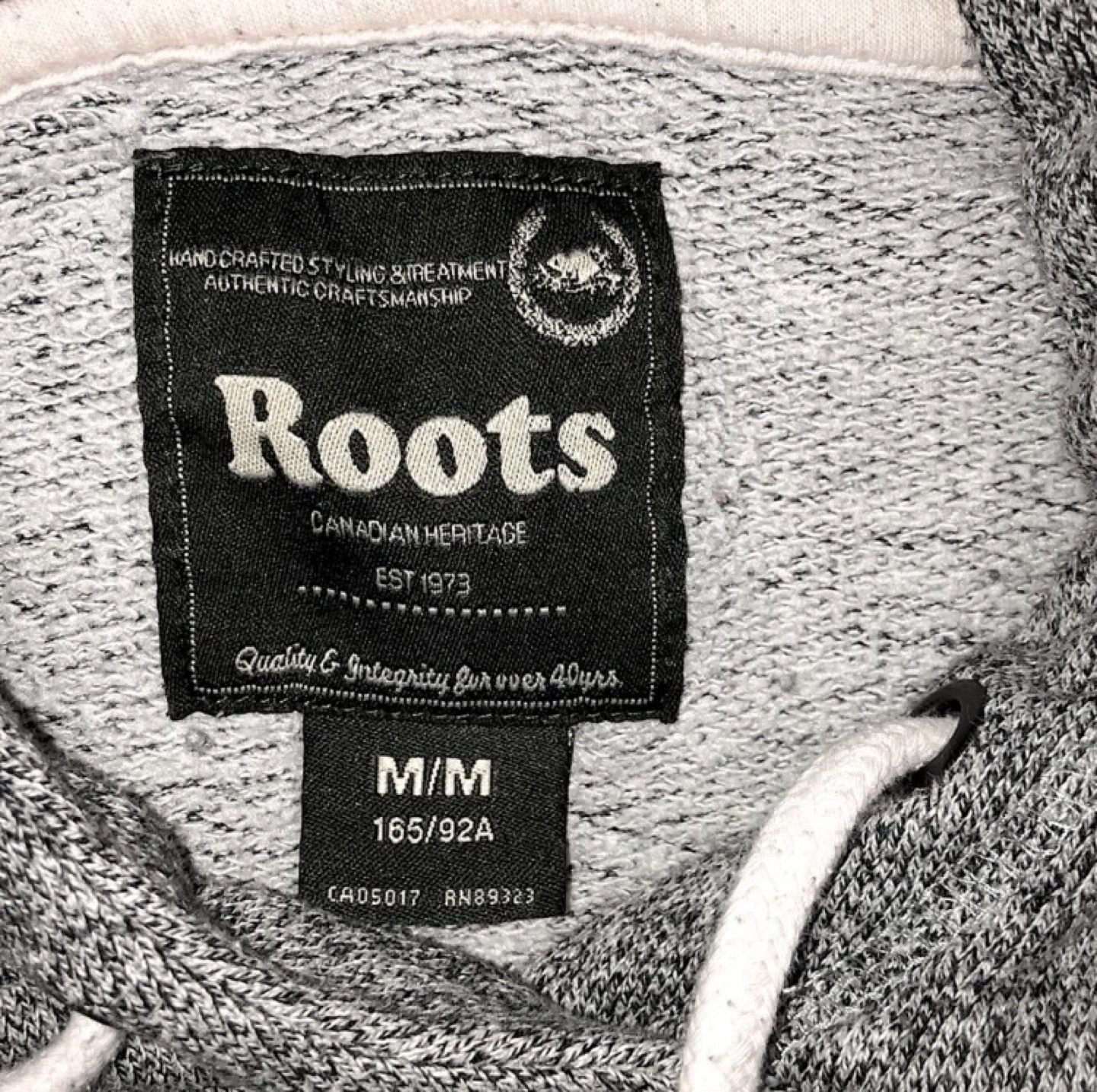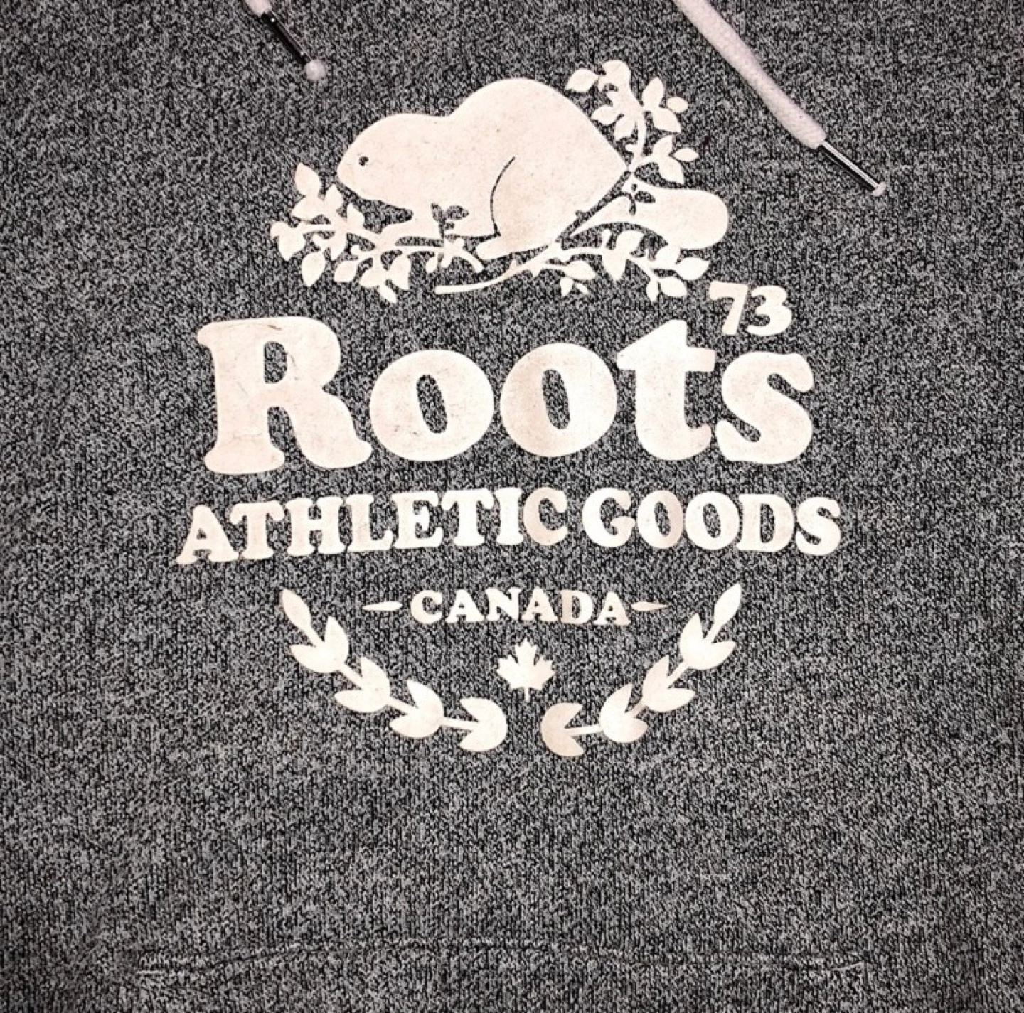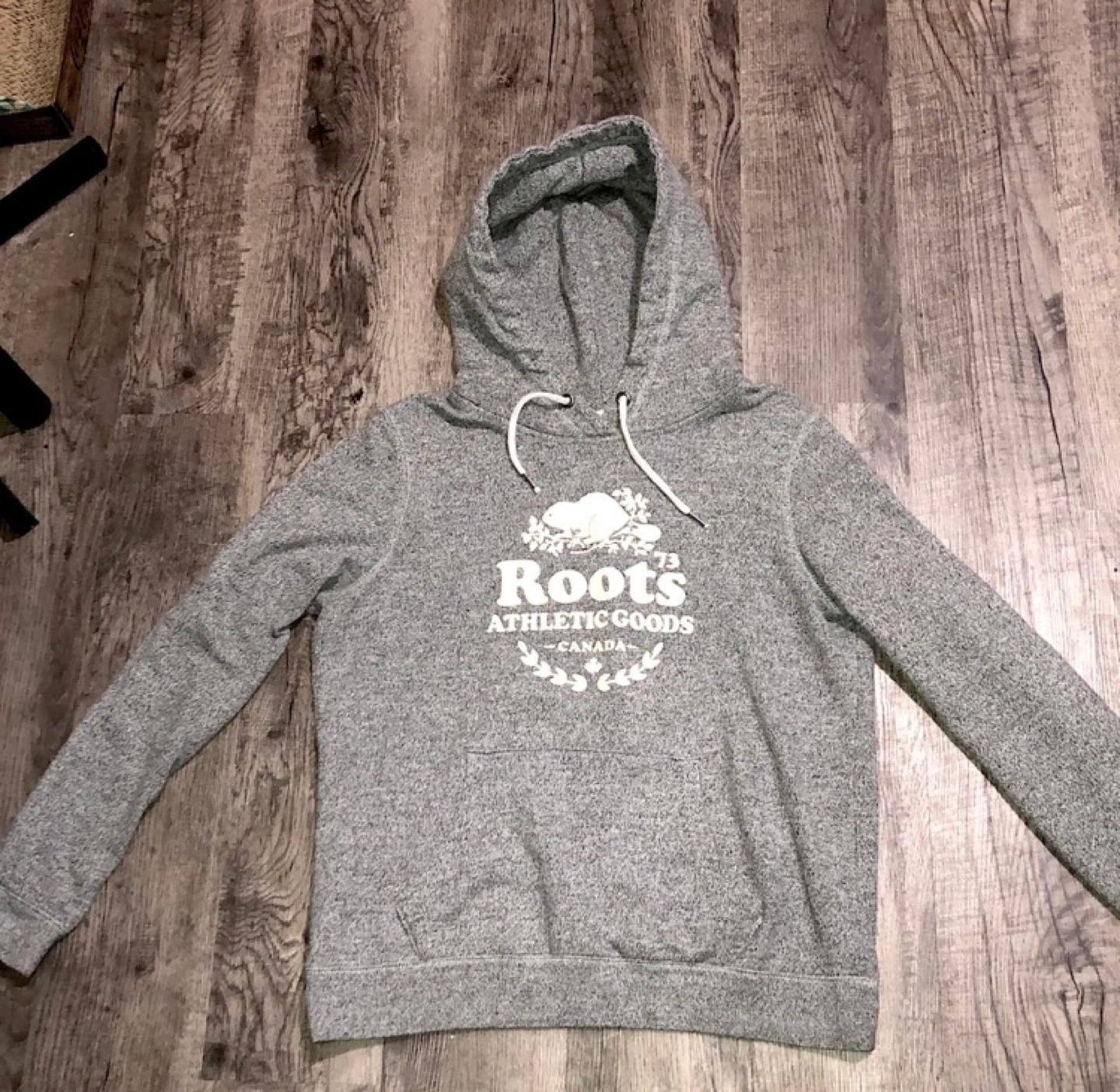 Grey Roots hoodie with a beaver logo and white drawstrings. Size M/M.