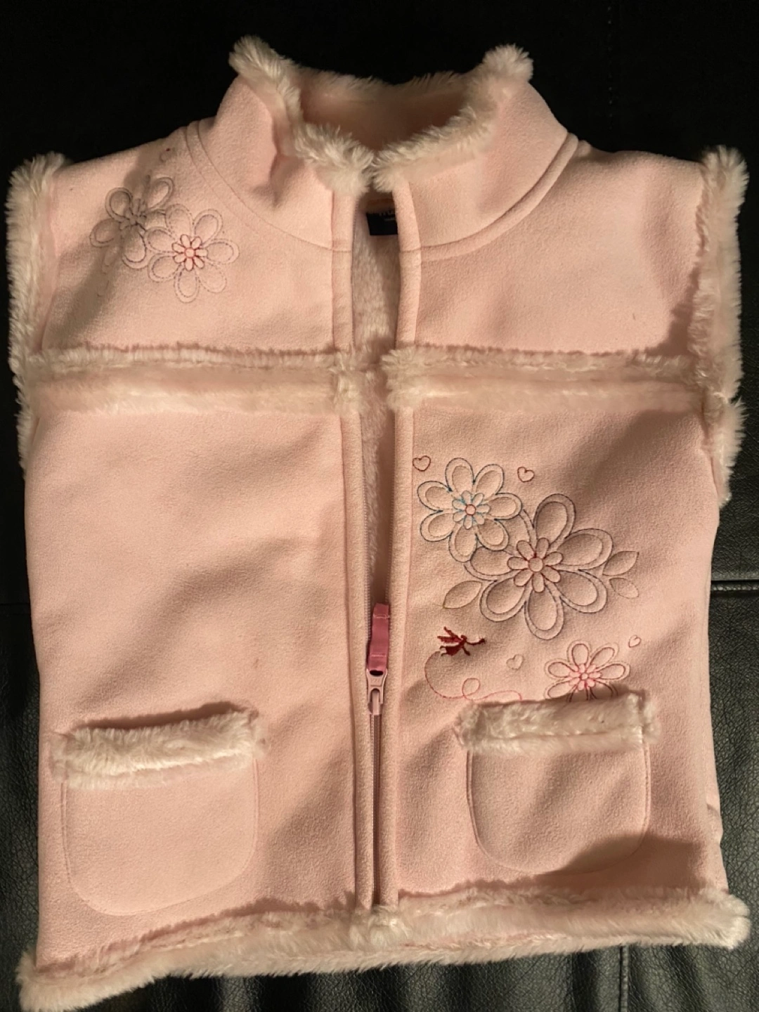 Mercury brand Pink faux fur vest with floral embroidery. Size M/M. Features two front pockets. Maybe fit 5 to 7 years old
