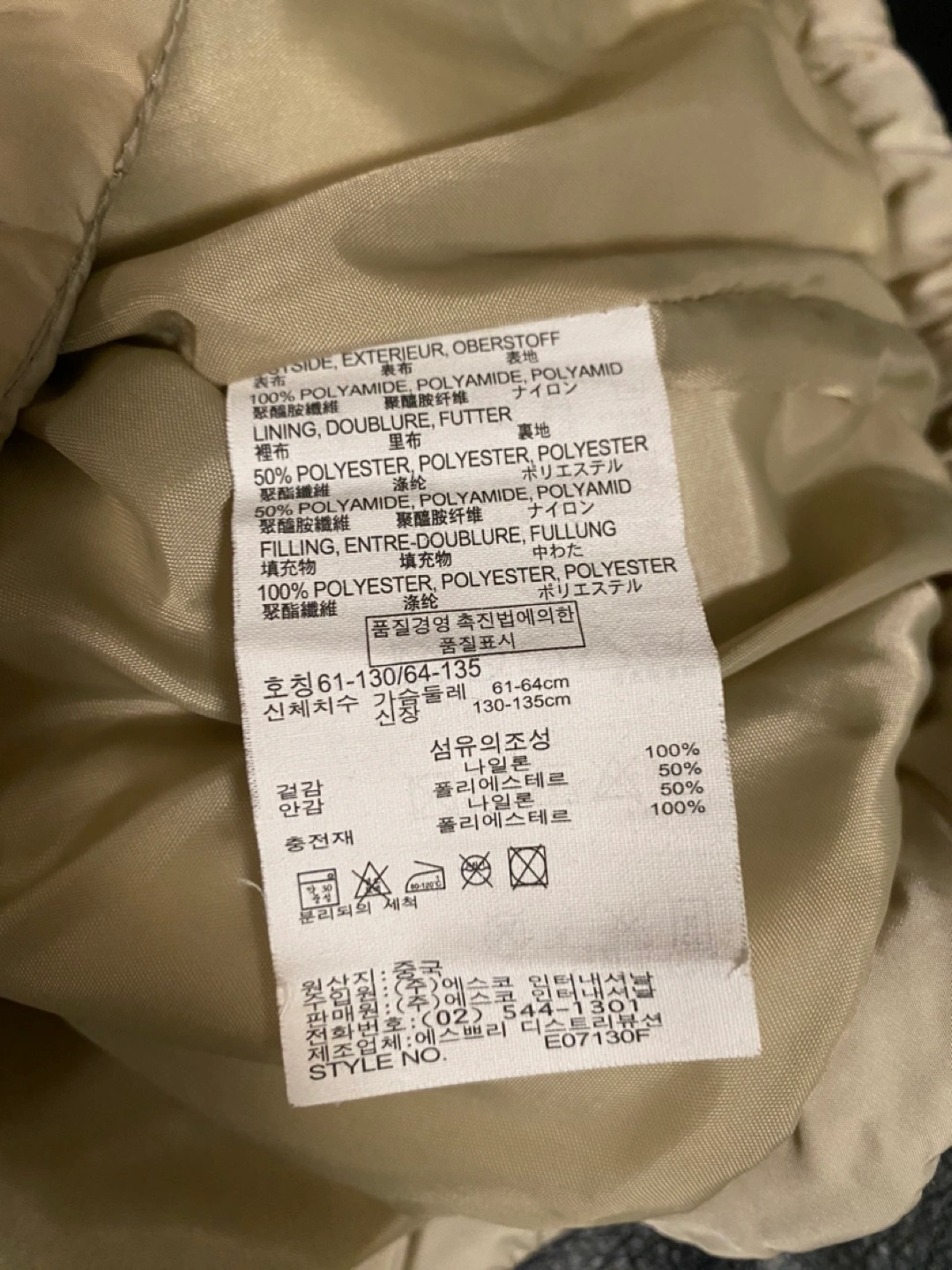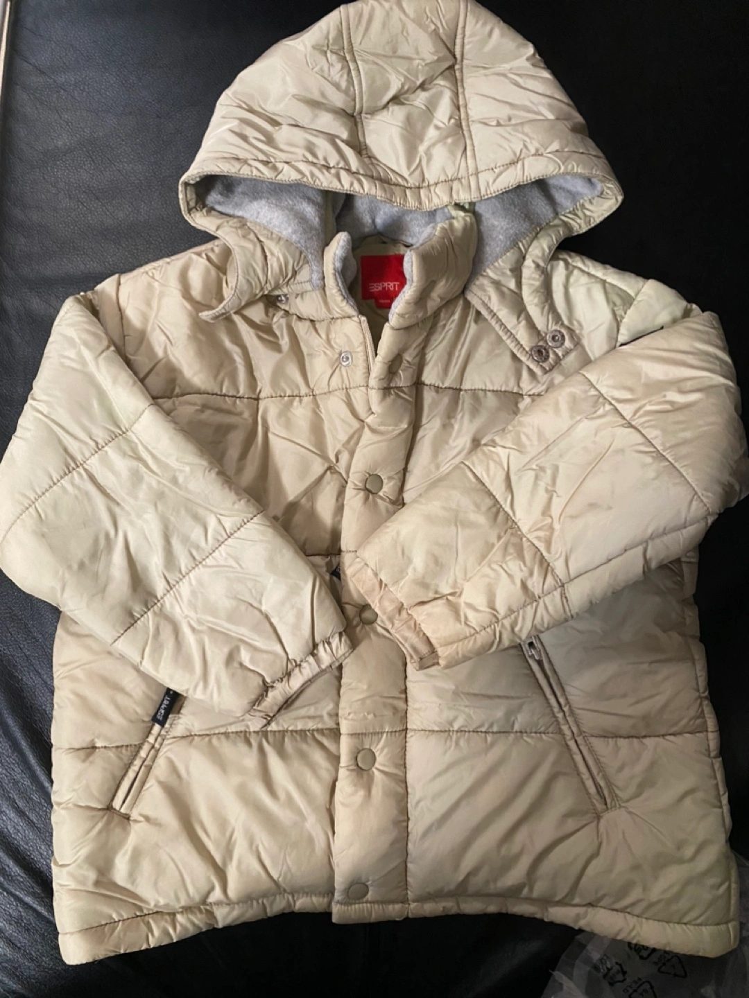 Light beige puffer jacket with a hood. Zipper and snap closure. Two zippered pockets. Esprit. Brand Size 128 cm to. 134 cm Maybe 5 years and above