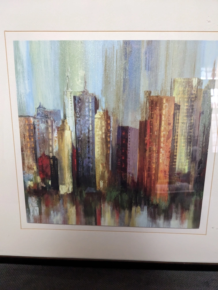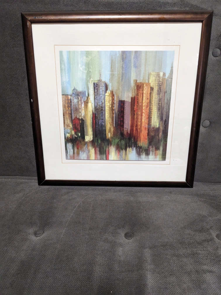 Framed print depicting a cityscape. Brown wood frame, 19x19 inches