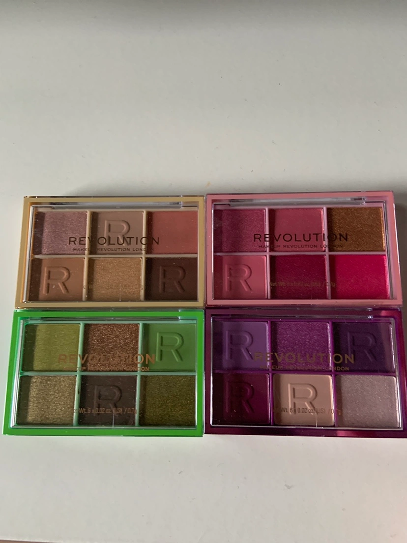 Four different Revolution eyeshadow palettes. Each palette has six eyeshadows. $10 for all 4