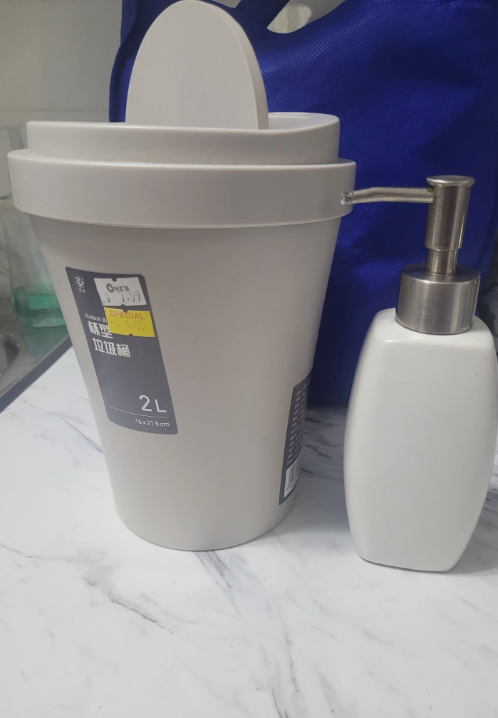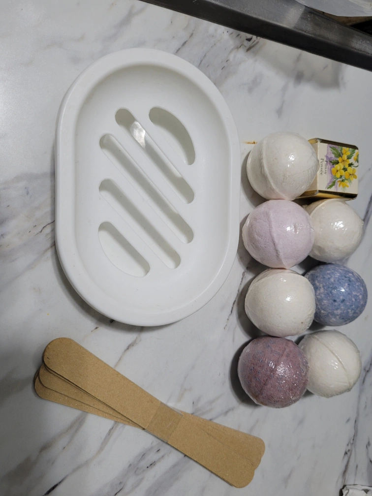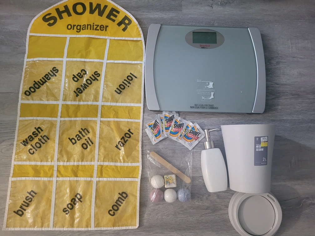 INCLUDING: - Scale -Organizer -Soap dispenser -Soap holder -Small trash cointainer(NEW!) -8 Bath bombs -Nail files(NEW) -On-the-go stain removal wipes Scale in perfect condition, turns on as soon as you get on top of it. I just stopped using after purchasing a small one(last photo).