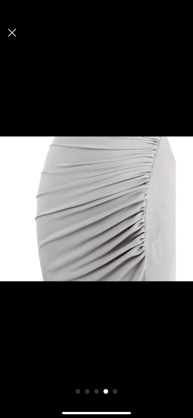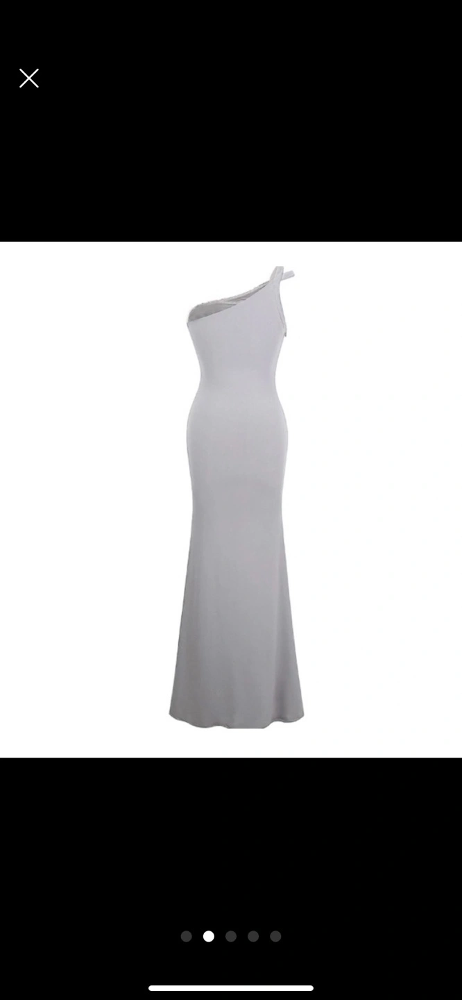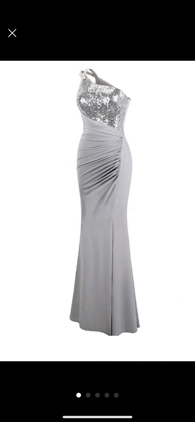 One shoulder grey dress with a silver sequin detail on the bust. The dress is a fitted style. The dress is floor length and has a side slit. Check my other listings for lots more