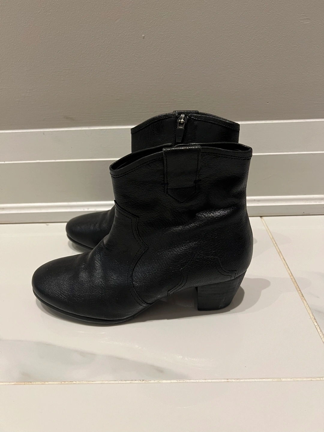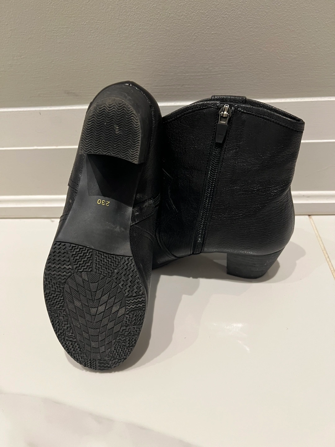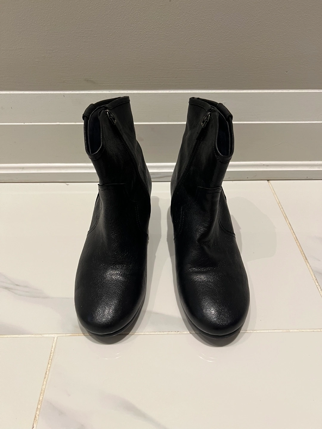 Black leather ankle boots with a low heel. Zip closure on the back. Size 6. Only worn couple of times, so almost new.
