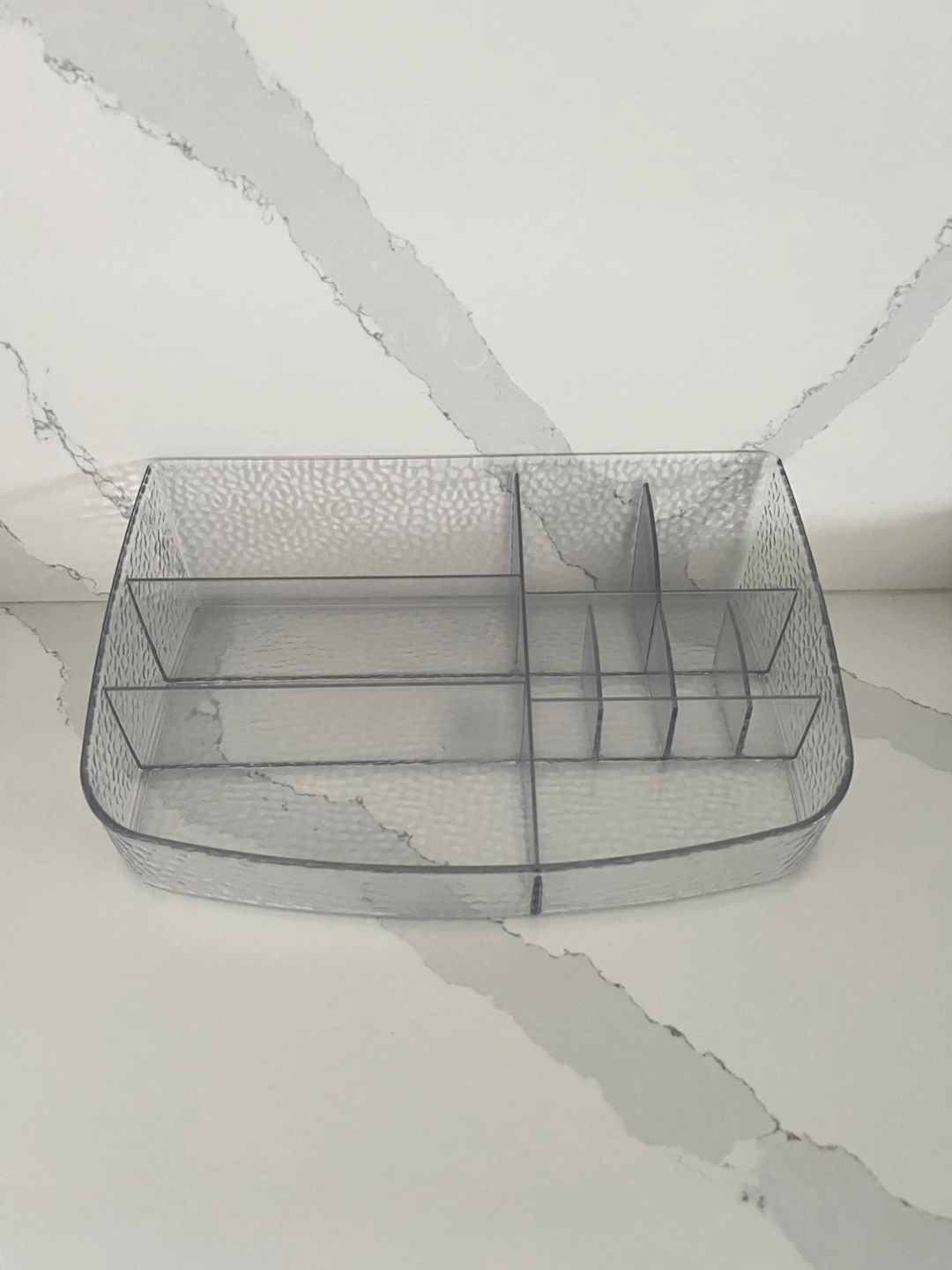 Clear plastic organizer with multiple compartments, perfect for organizing makeup or other small items.