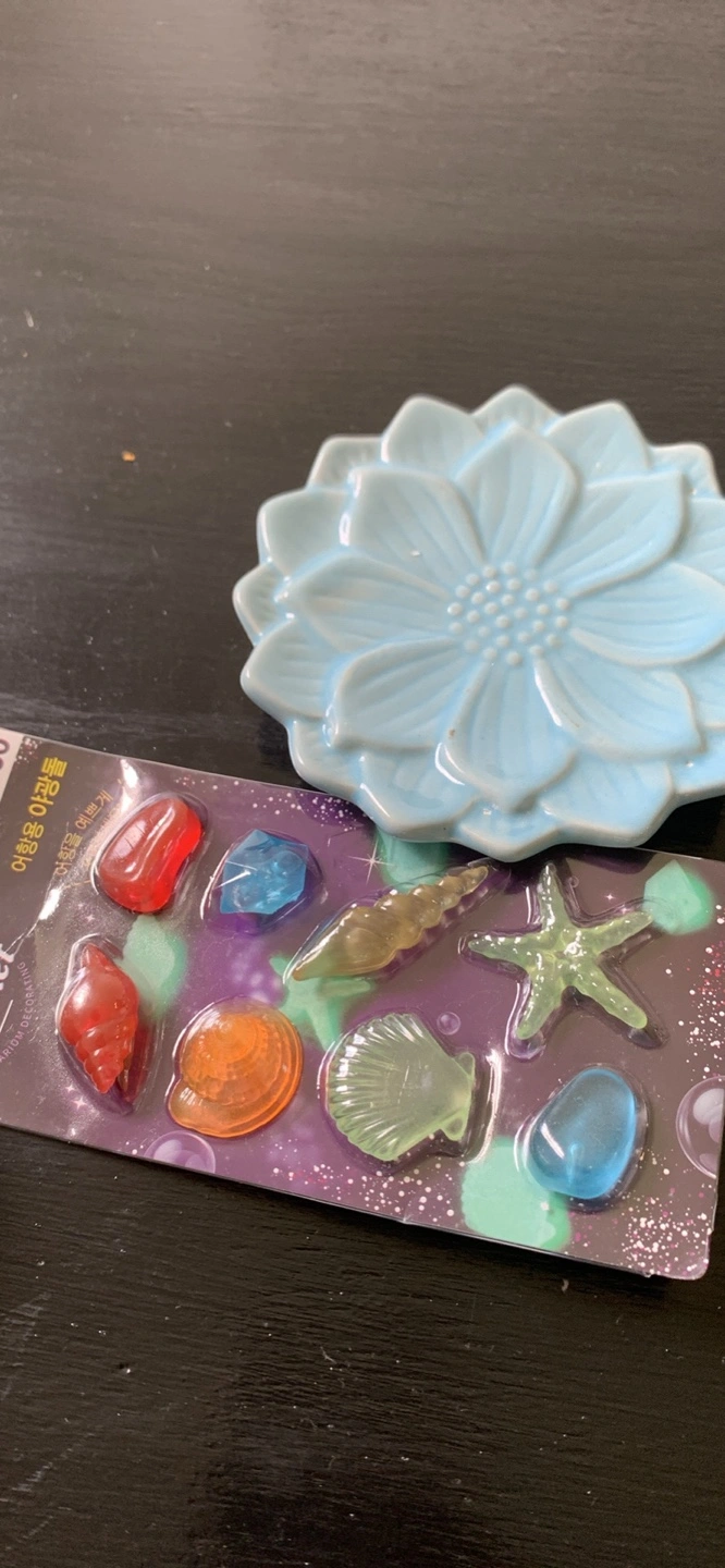 Set of decorative aquarium items, including a ceramic flower-shaped dish and a pack of assorted plastic sea life decorations. Both for 5$