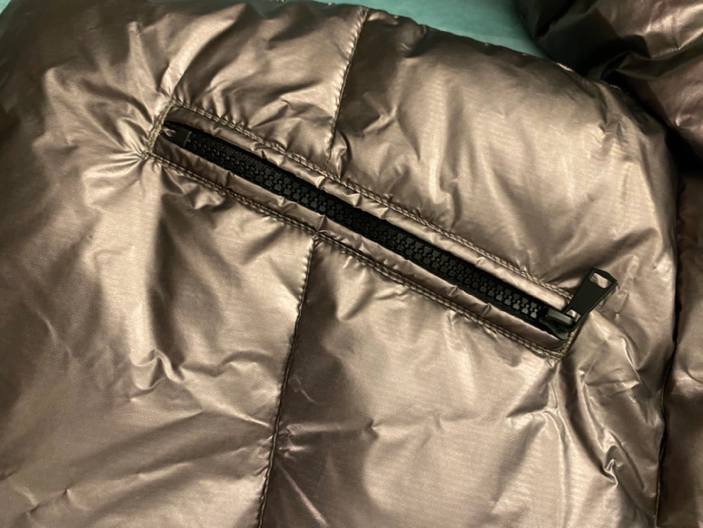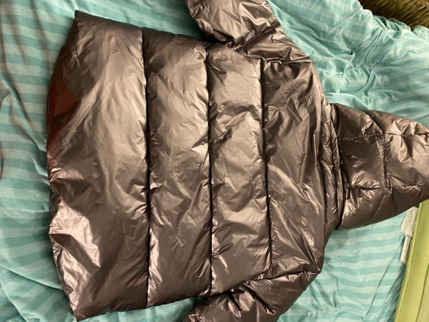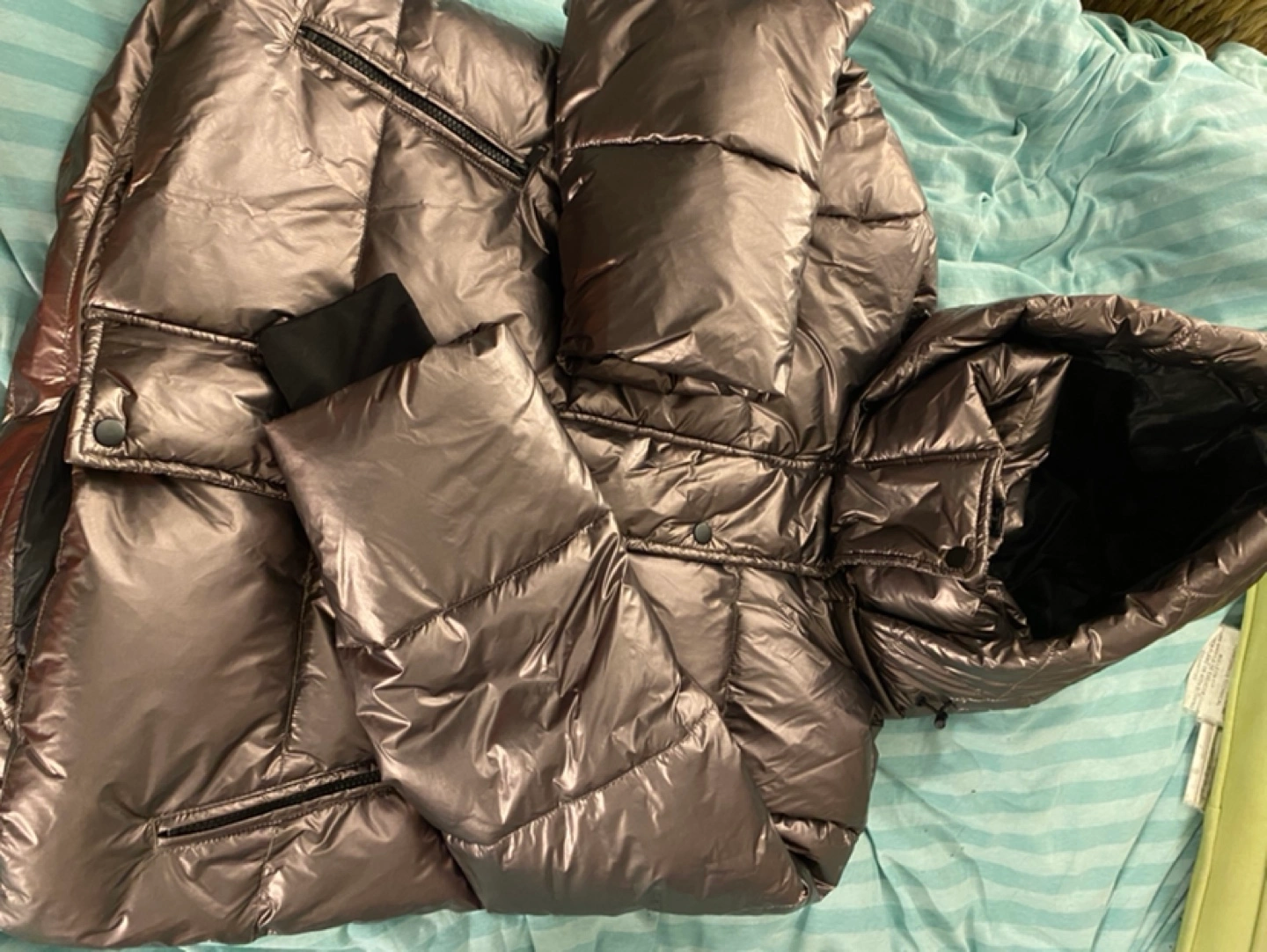 Metallic puffer jacket with a hood. Features a zipper and button closure. Has two zippered pockets at the front.