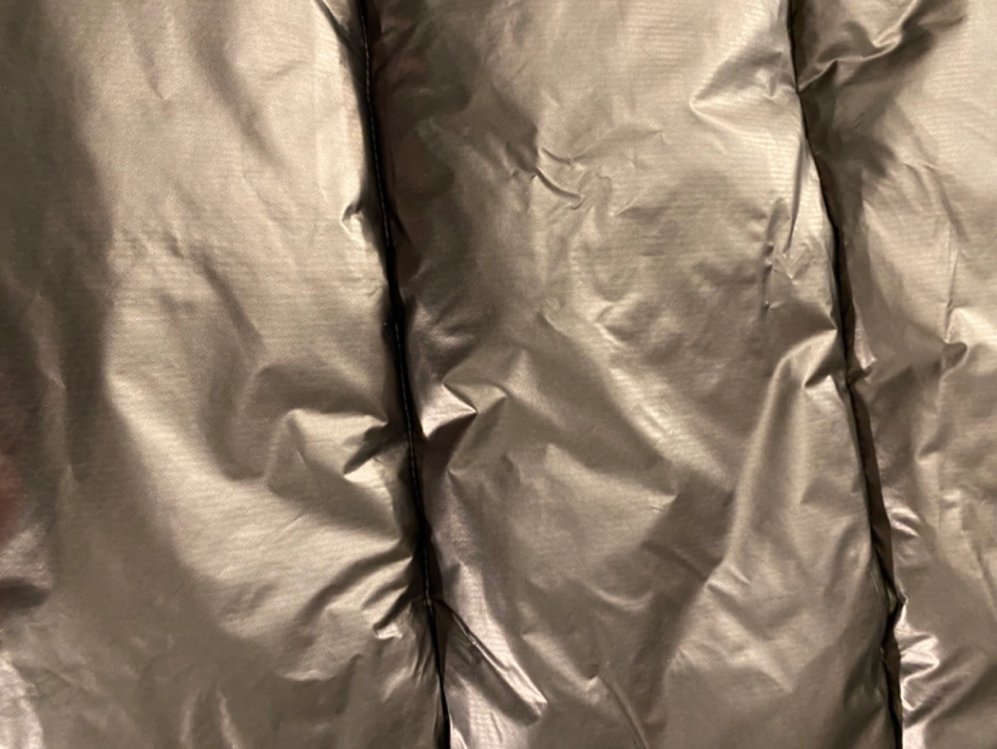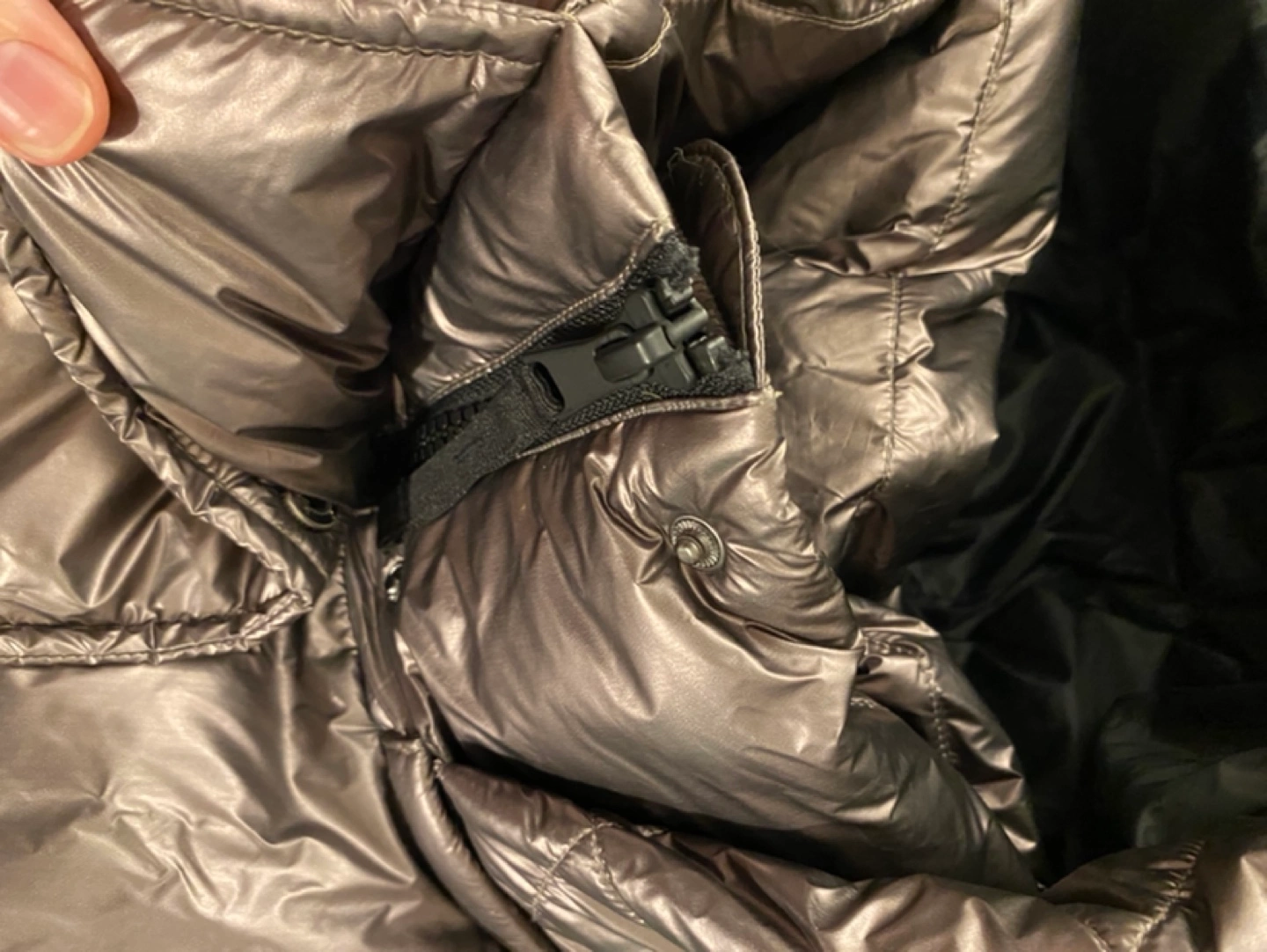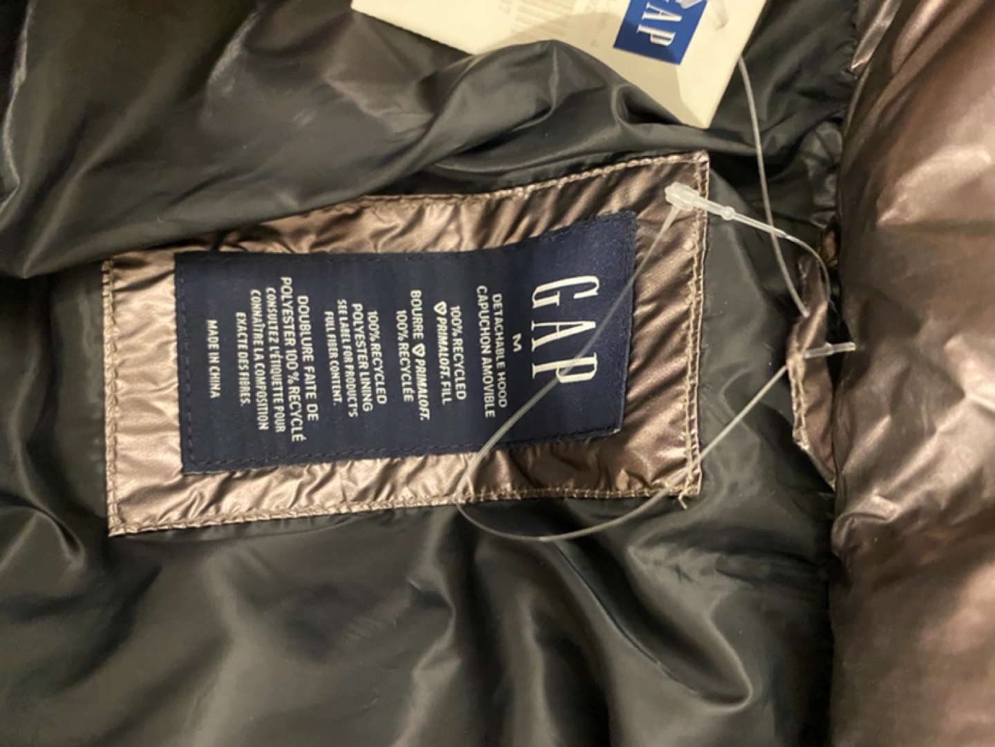 Metallic puffer jacket with a hood. Features a zipper and button closure. Has two zippered pockets at the front.